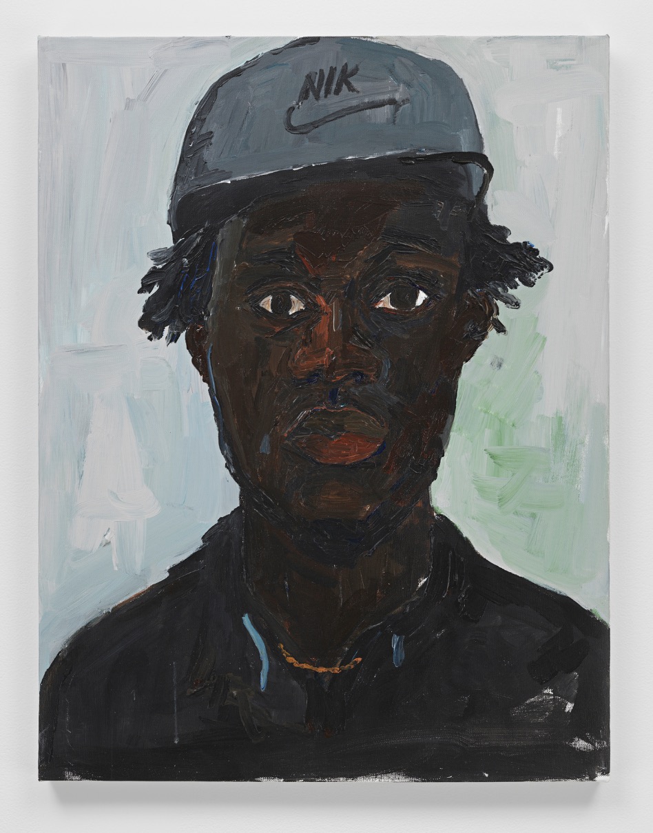 Consistent with Taylor’s oeuvre, these new paintings weave together visual references spanning contemporary politics, American social adversity, and the faces of his milieu articulated through the language of portraiture. However, this latest series includes many works created during the artist’s recent travels in Senegal, compositions hatched from contemplations on the African diaspora, colonialism, slavery, the odds of diverging routes of struggle, and also on unity and seeing oneself in the face of a stranger. In one, he paints the photographer Deana Lawson, depicting her holding her camera and resting pensively on the grass, a sort of meta-portrait that hints at her own modes of portraiture while working back inwards towards a shared aesthetic sensibility. By contrast, his portraits of characters in the city of Dakar showcase a series of vantage points and ideologies, a mapping of the world from his perspective and creative capacities.