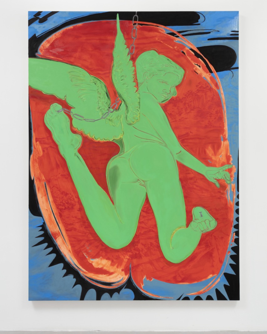 A similar effect can be seen in the pieces Wokey Doke, albeit in a more subdued and bizarre expression. Two figures, one shaded grey and another with lighter, pinkish skin are posed together, with a more cartoonish rendering of a female body rendered in the background. Almost appearing as if it’s half finished, the two characters’ human features are bizarrely elongated or twisted, and a realm of small, angelic (or perhaps demonic) figures cavort around their bodies. Ellis’s interest in readings and perceptions of intent, of our ability to ascribe negative or positive valves to these characters seems doubly emphasized by the ambiguous nature of the sprites depicted, almost as if value judgements have been emptied out of the image, with only the bodies, concepts, and styles remaining.