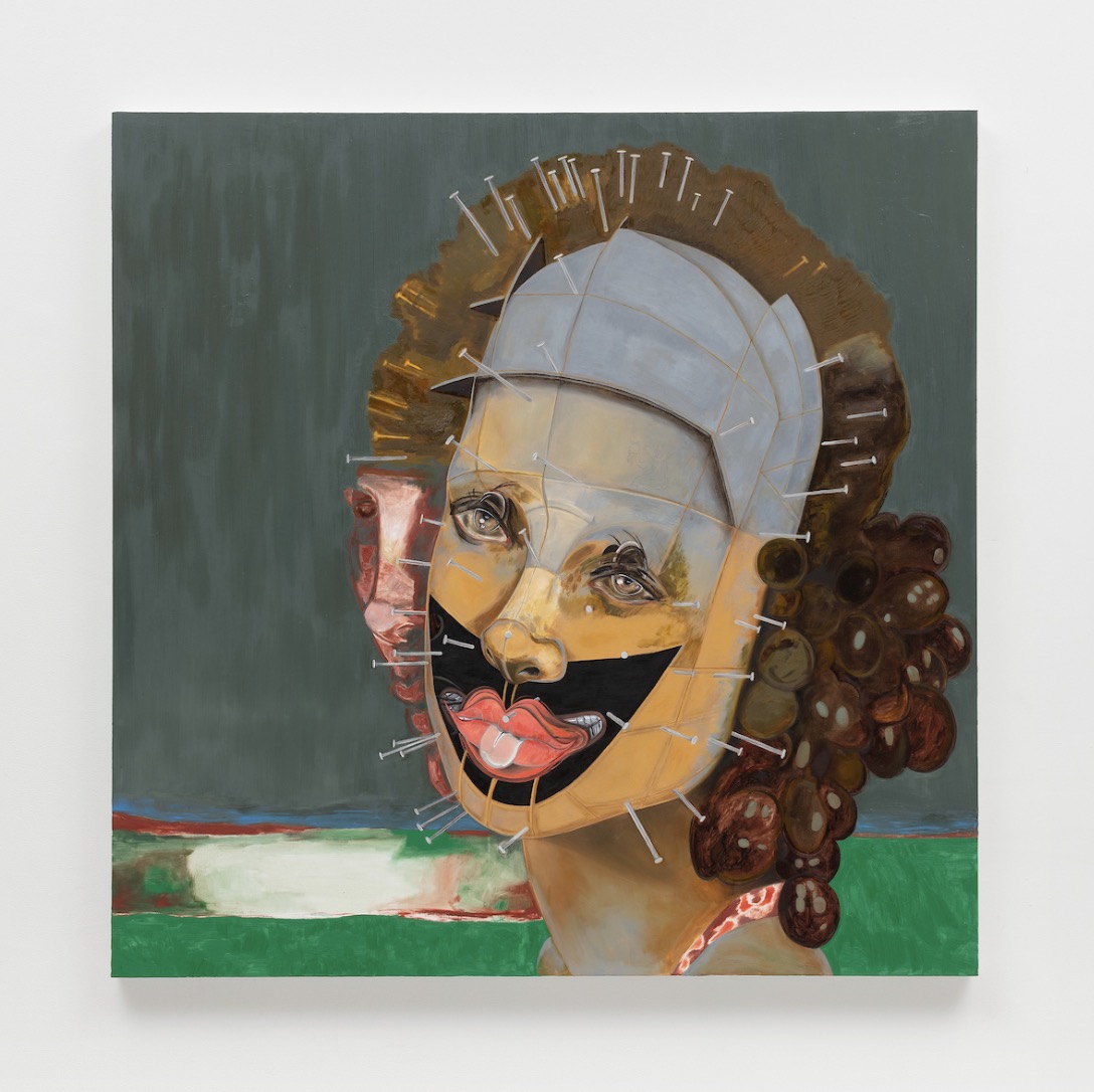 The works on view in this show seem to lean directly into this concept, establishing tropes and ideas about its characters and concepts through a range of highly-stylized arrangements and juxtapositions. In one, Ellis paints a detailed, emotive portrait of a woman, mixing skin colors and tones with a range of disparate facial features, lending the work a a complex and ultimately challenging mixture of emotions that turn the work into a traumatic space of divergent moments, then dynamites this system with the inclusion of rows of nails poking up from the figure’s face. Recalling the horrifying Pinhead character from the film Hellraiser, Ellis’s piece hints at a sort of spiritual languishing, a moment where cultural frameworks open the door for deeper investigations into states of mind, identities and experiences, all bound up in a moment’s glance.