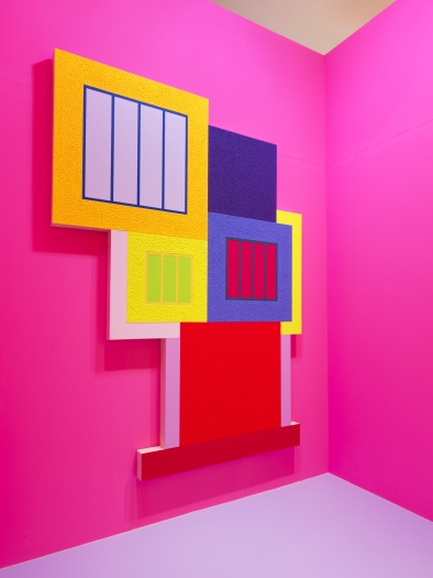 A multi-colored, labyrinthine structure in the ground floor gallery housing eight new shaped-canvas paintings, Halley’s work in the show is intended as a seemingly boundless movement through space and time, the experience of movement gradually disintegrating under the overwhelming inputs of color and form. The installation is enclosed by tall neon yellow walls, which functions both as a colorful bound and a barrier to experiencing the work from an exterior, instead requiring a distinct sort of surrender from the viewer. Organized around a glowing yellow core, the interior of the space is held apart, and the viewer may only orbit its center, never arriving at a final spatial conclusion. Time becomes an endless spiral, the viewer never fully arriving but always passing back on spaces that were visited before, until a sense of disorientation ultimately wipes the sensations of difference slowly from memory.