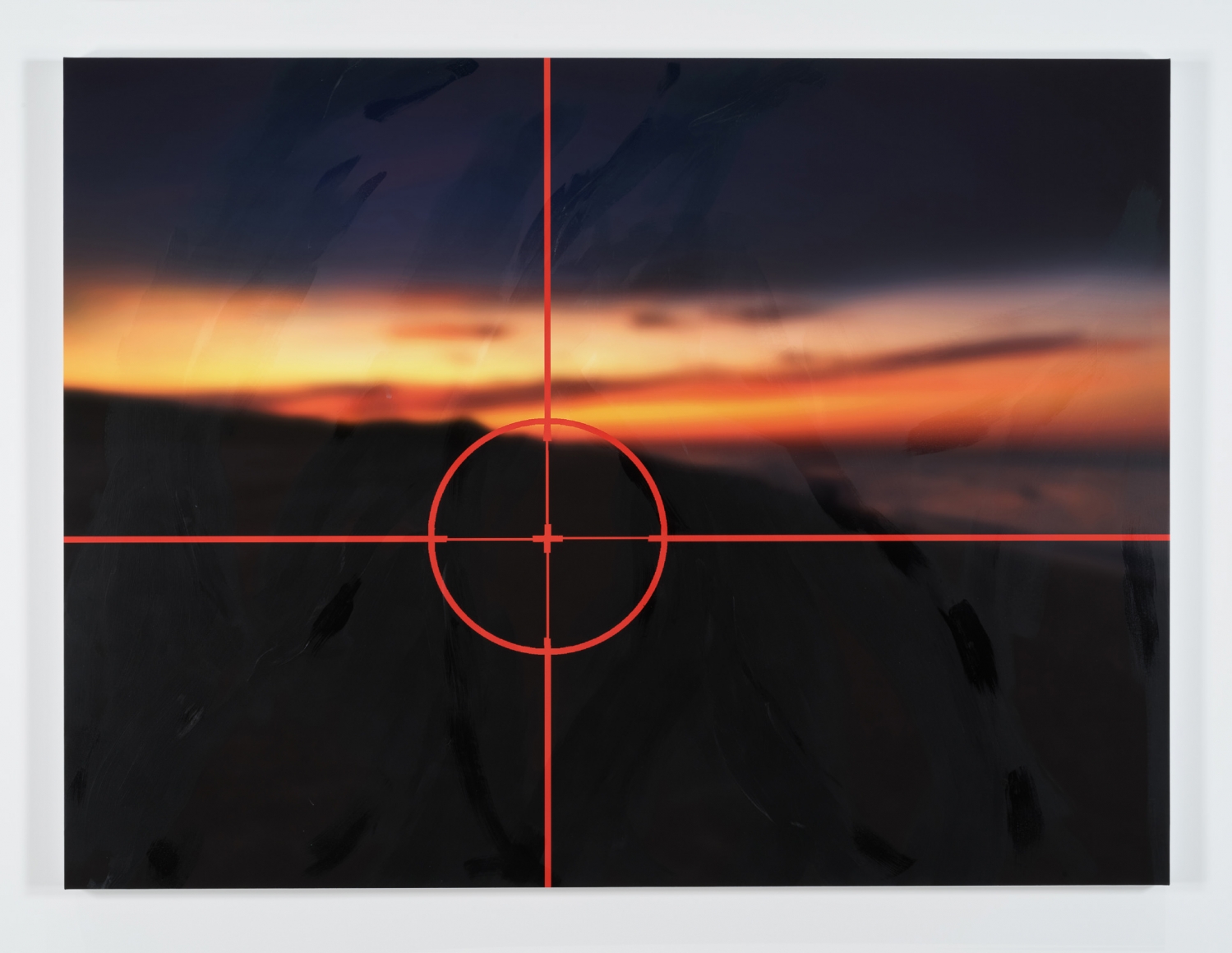 In a series of new works on canvas, Gordon presents a world of safety and familial intimacy, surreptitiously undermined by insidious, unseen forces. Photographs of a group of revelers huddling around a beach bonfire are softened and overlaid with digital framing marks around the human figures suggests a body under watch, the subject of surveillance technology or facial recognition software. Embracing an expanded sense of constant exploitation and observation, her works seem to explore a world where all moments are captured and recorded, where ordinary events are processed and consumed by unseen agents, whether human or otherwise, and turned towards a marketable, understandable message, one often wielded by capitalism. Gordon amplifies this phenomenon, referencing iconography from the world of music as it dovetails with youthful rebellion. The various crops and crosshairs allude to the logos of both Black Flag and Public Enemy, two groups emblematic of questioning authority and rising above structural oppression. Gordon’s emphases seem to echo their animosity, drawing the very same lines as our tyrannical tech overlords, yet with the express purpose of reasserting control of our own dominions.