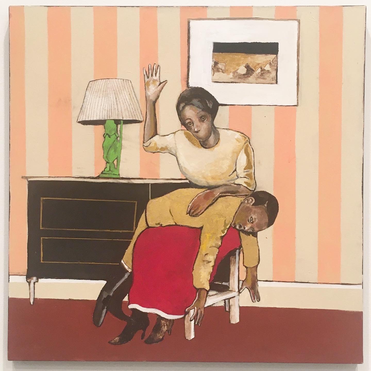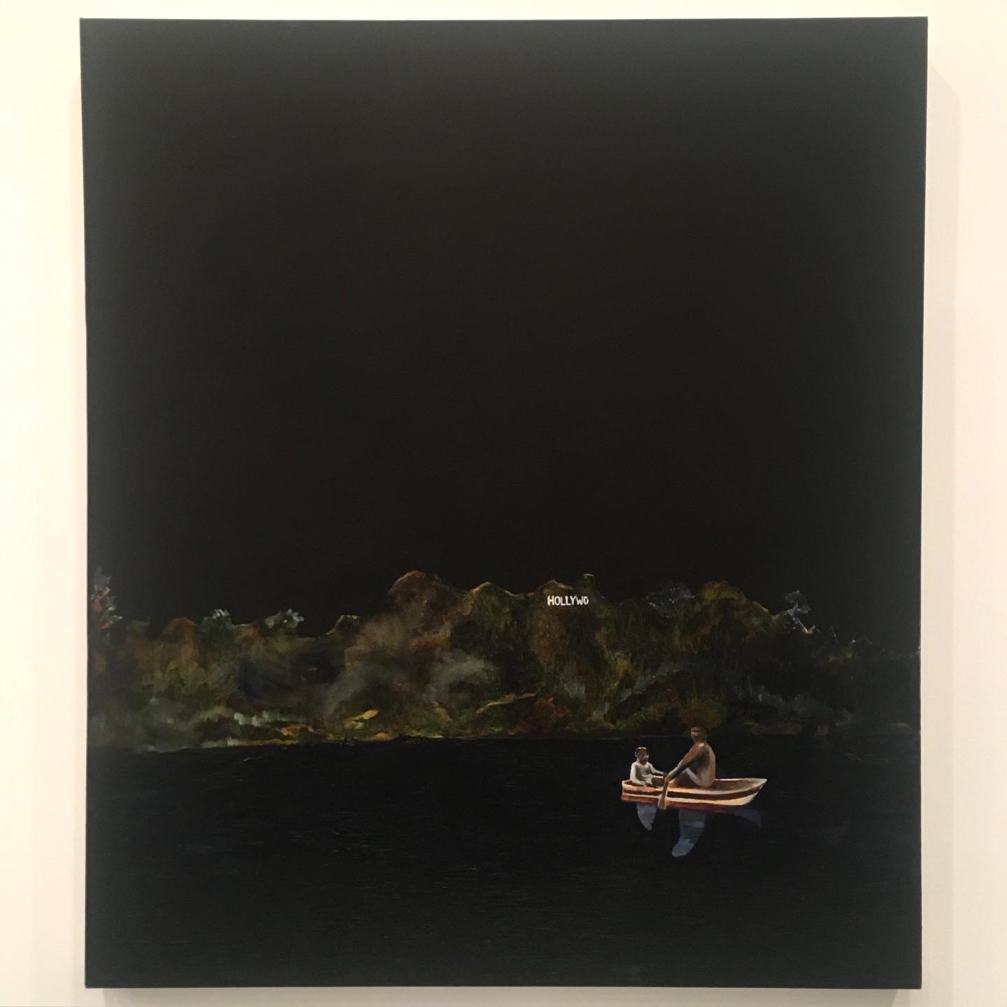 The works on view highlight both parts of Davis’s practice, featuring more than twenty of his most enduring paintings, as well as models of previous exhibitions curated by Davis at the Underground Museum. Loneliness and tenderness suffuse his rigorously composed paintings, as do traces of his abiding interest in the last twenty years of painting and portraiture. Hints of Luc Tuymans and Kerry James Marshall play across his work, fusions of the real and the fantastic twisting in and out of his depictions. In some works, a backdrop of rich black serves as the space for nuanced interplays of light and space, figures in a boat gazing up at the night sky and silhouetted against the light of the moon, or flat depictions of the domestic, like one work where a woman spanks her child. The sense of a world mired in both the immediate and the far off is a striking showcase of his unique graphical skill.