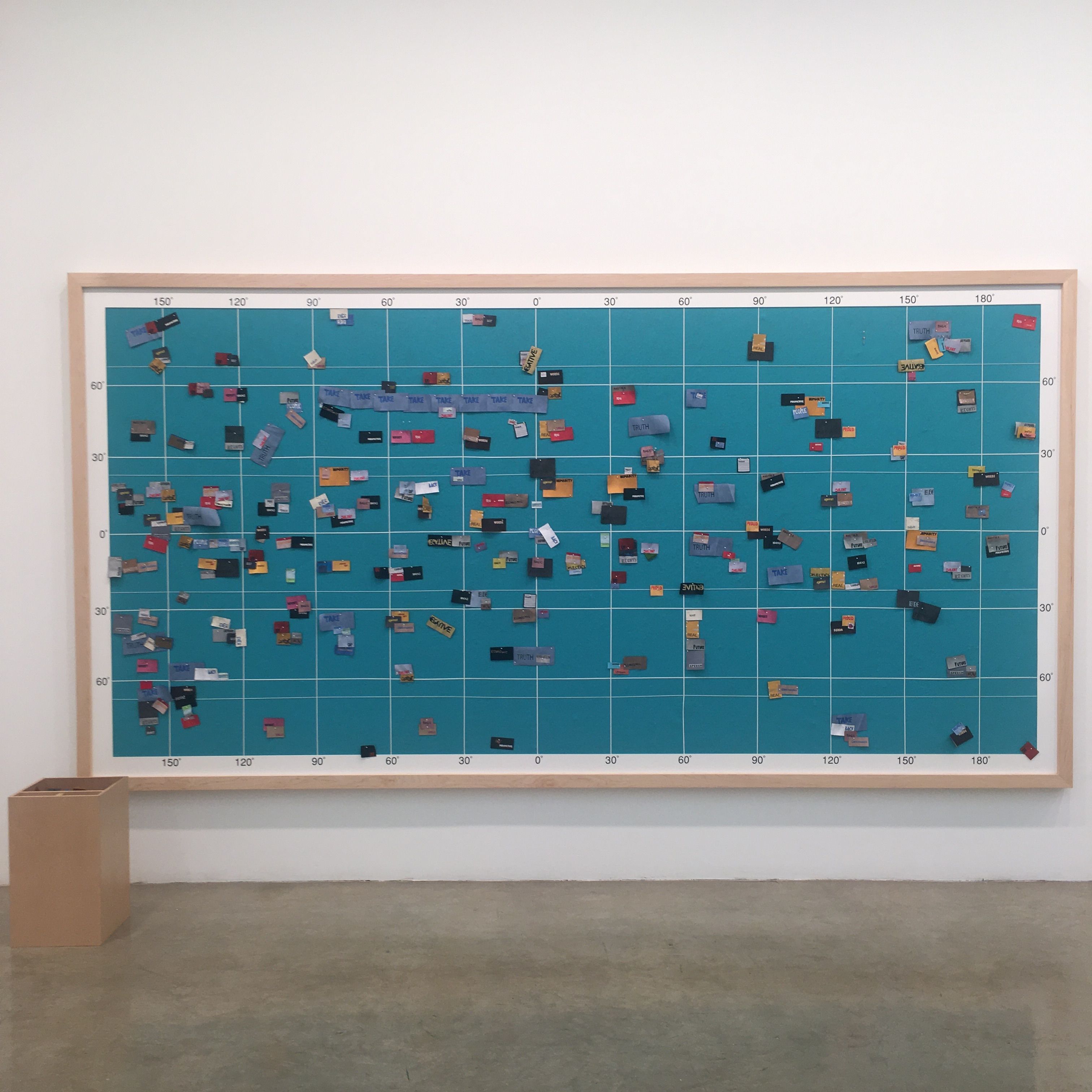 Other work delves into more concrete questions of social responsibility and human empathy. Rivane Neuenschwander offers a space with the same intention, that of connection, with his interactive work Watchword. Faced with an abstracted version of the world map, viewers are invited to use internet images words from protest signs embroidered on swatches of fabric to create phrases and slogans. These texts can be pinned to the viewer’s own clothes or to the map itself, creating a patchwork of personal and political messages. Neuenschwander uses a familiar personal craft learned from her mother to explore the spaces between personal and political, and invites viewers to do the same.