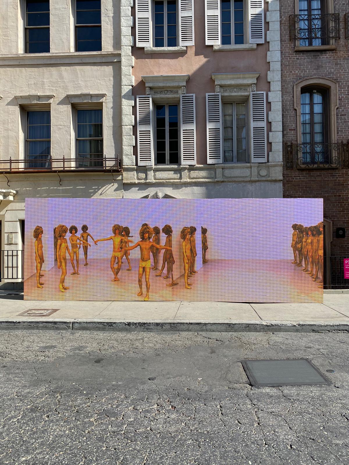 Outside in the lot, where a miniature version of New York City had been erected, a range of works invited an intriguing engagement with place and concept. One particularly striking work was a massive Lorna Simpson video piece, playing a selection of dancers twirling and moving, a peculiar reframing of a space meant to both express concrete localities and also remain relatively blank, reframed by its performers.