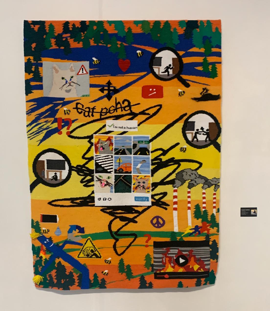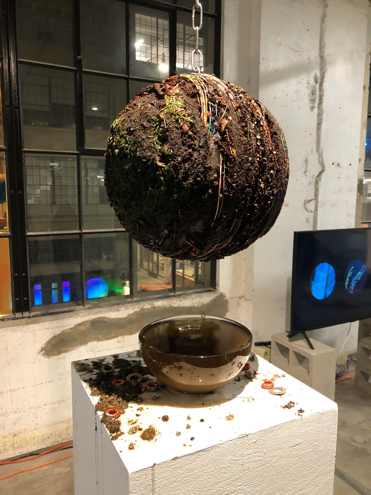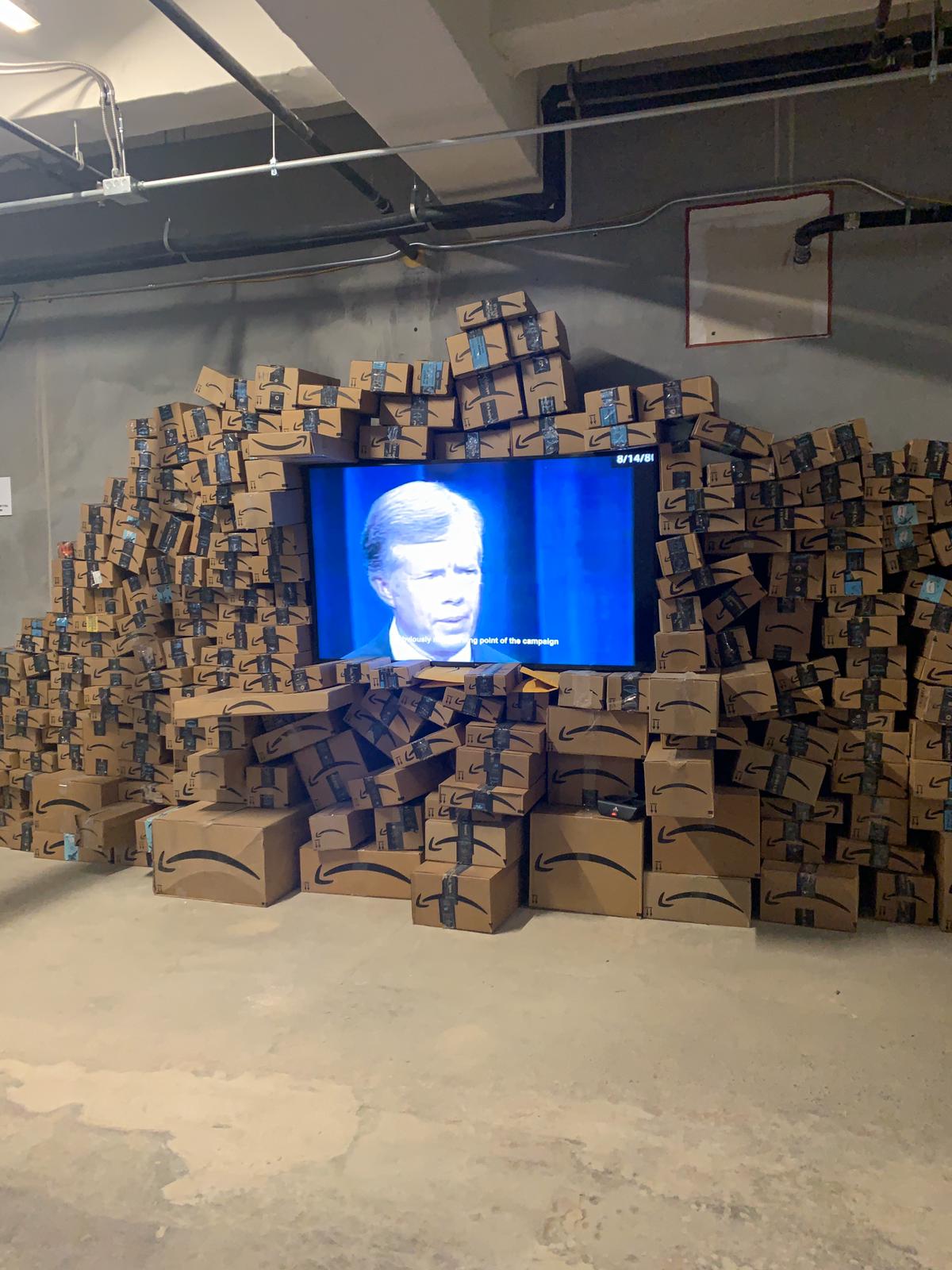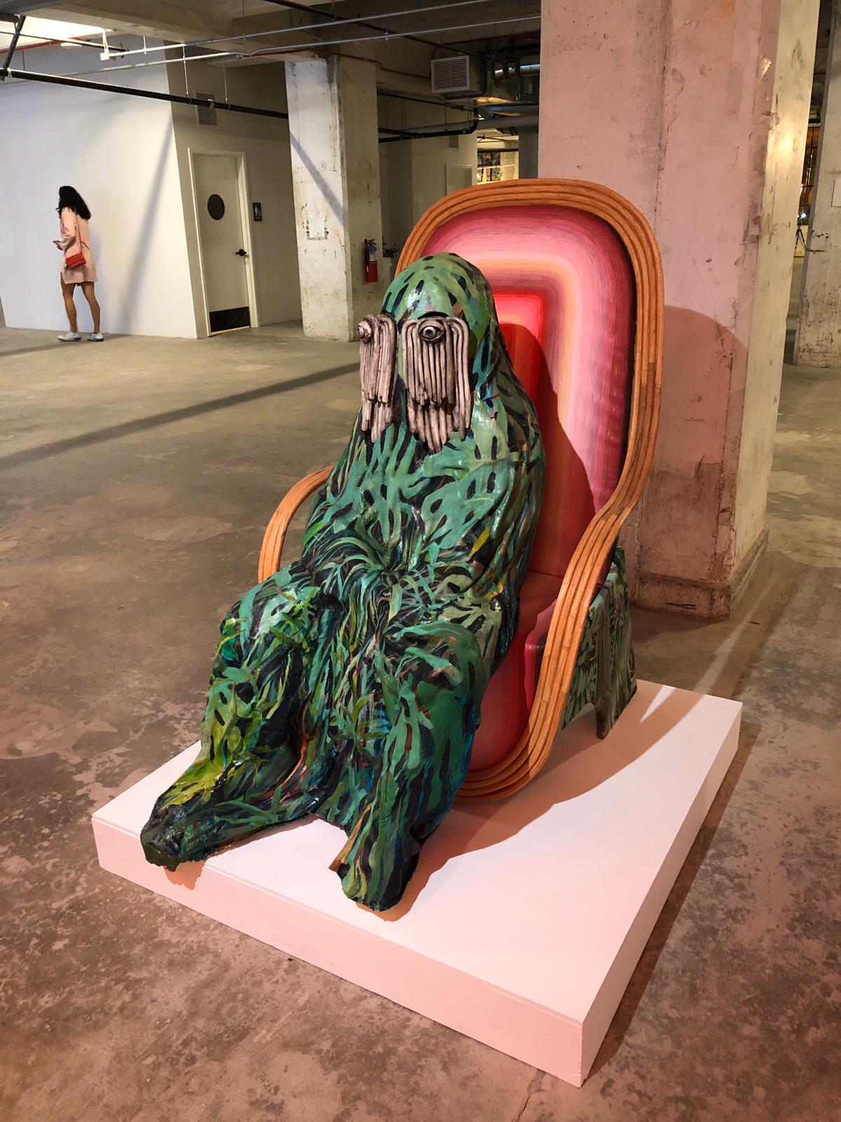The fair’s exploratory and enigmatic atmosphere was readily apparent this year, with ample works exploring a range of intriguing concepts and constructions.  There was a massive video sculpture by artist Nina Sarnelle, situating a video piece in the center of a towering mass of Amazon shipping boxes, while nearby, artist Steve Hash’s more subdued sculptures of ghosts, or more specifically, the bedsheets used by children to create ghost costumers, stood on their own, a peculiar sculptural arrangement that seemed both subtly unnerving and distinctly comical.  Elsewhere, artist Sarah Bereza was presenting a lumpy, strange figure hunched over a chair, while artist Eli Joteva had brought works that featured hunks of natural material arranged in precarious states, like a massive clod of what appeared to be soil hanging over a pedestal.