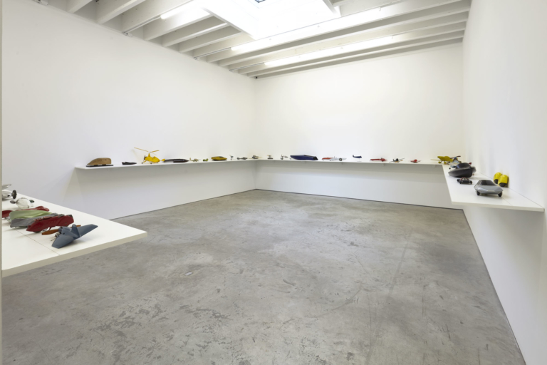 Artist Robert Grosvenor could perhaps best be described as an artist invested in space.  His interests rely not only on how the object exists within it, but equally how the space around an object twists and responds, moves and carves up space.  His sculptures capture a similar idea, pulling the viewer through their specific materiality and unconventional formal language that at one point might incorporate a distinct industrial materiality, while at others moving into a hard-edged, classic minimalism.  Each of the elements of this historical movement’s conceptual interests are there: heft and weight, density, scale, and even color, yet Grosvenor, more and more over the past years particularly, seems to take these principles and turn them towards the everyday, mining the language of the world around him to find new ways to ask similar questions . For his third show at Karma in New York, Grosvenor continues this particular interest in the realm between space and object, presenting a room-sized sculpture that the artist refers to as a “block of water,” as well as a collection of found and variously altered models of aircraft, watercraft, and automobiles.
