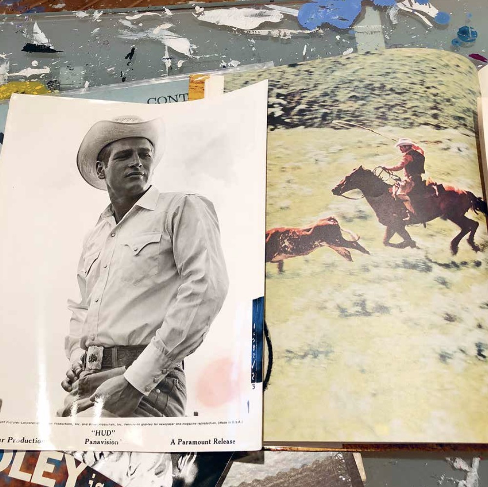 Rubin allows countless threads and objects to intersect throughout the book, culling together images of books and objects, film stills, photographs and essays from Prince’s personal collection and his works documenting the varied forms of the Cowboy in American media, from his cropped Marlboro ads to his inkjet and paint embellishments of classic pulp covers, on to his more recent landscape photos.  In this loose, flowing series of interconnecting media framings, the book echoes the dense reference systems of Prince’s work, and ever-refracting codes of the modern image that he so often challenges and works through.  The Marlboro ads are a classic touchstone, but Rubin delves as well into Leonard McCombe’s photos for LIFE magazine, which seem to have been lifted clean out for Marlboro’s ad series.  Hollywood factors as well, and includes shots from classic Westerns like The Treasure of the Sierra Madre, HUD, and even Blazing Saddles, or the work and collections of writer Larry McMurty, writer of the western novel Lonesome Dove.