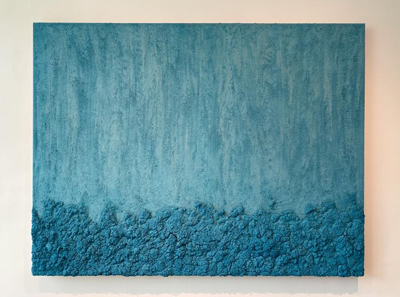 Late last year, Sodi spent two weeks in Hong Kong, creating a body of new works specifically exploring the depths and boundaries of the color turquoise.  Drawing particular inspiration from the painter Wang Ximeng’s twelve-meter-long landscape, A Thousand Li of Rivers and Mountains, painted over the course of six months in the year 1113 CE, Sodi drew inspiration from the deep azures and turquoises of the work, and sought to incorporate that same style into his new pieces.   Drawing on both macroscopic and microscopic biological forms, the artist twists these compositions into evocative and challenging landscapes in their own right, valleys and clefts of paint that both explore Wang Ximeng’s work and turn its ideas towards a more literal approach to landscape.  Rather than drawing on the material as the point of genesis for an exploration of landscape, Sodi turns the material inwards, towards the inherent capacity to create and shape the landscape anew.