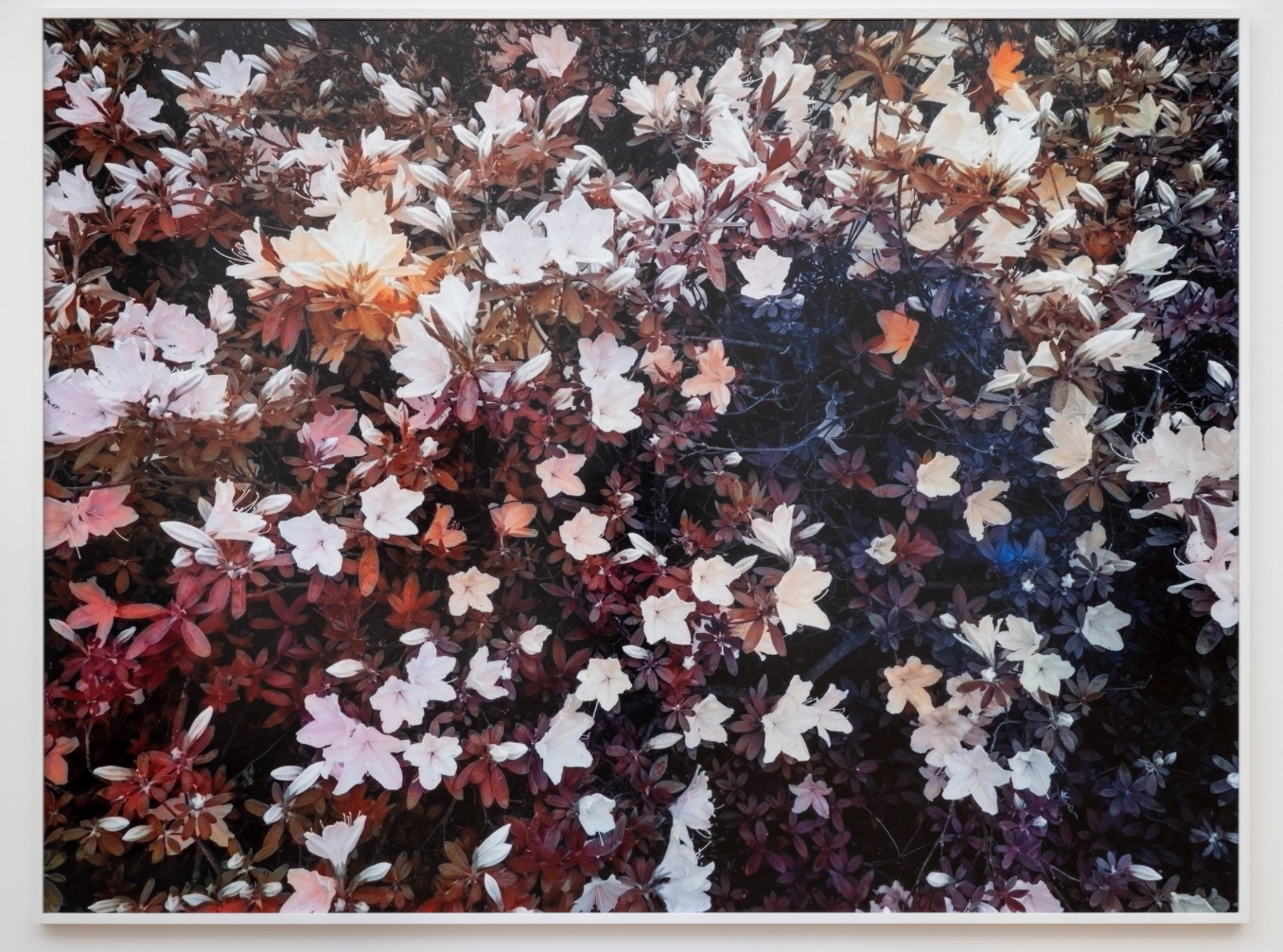 By contrast, the show’s titular series, Bloom, presents a series of large-scale photographs that depict flower formations conceptualized by various computer vision algorithms created to analyze the constituent parts of real-life photographs. The colors and shapes in the images represent similar areas that the AI has detected in learning from other images of flowers. They do not represent real-to-life colors so much as what the AI thinks the different parts of the images are.