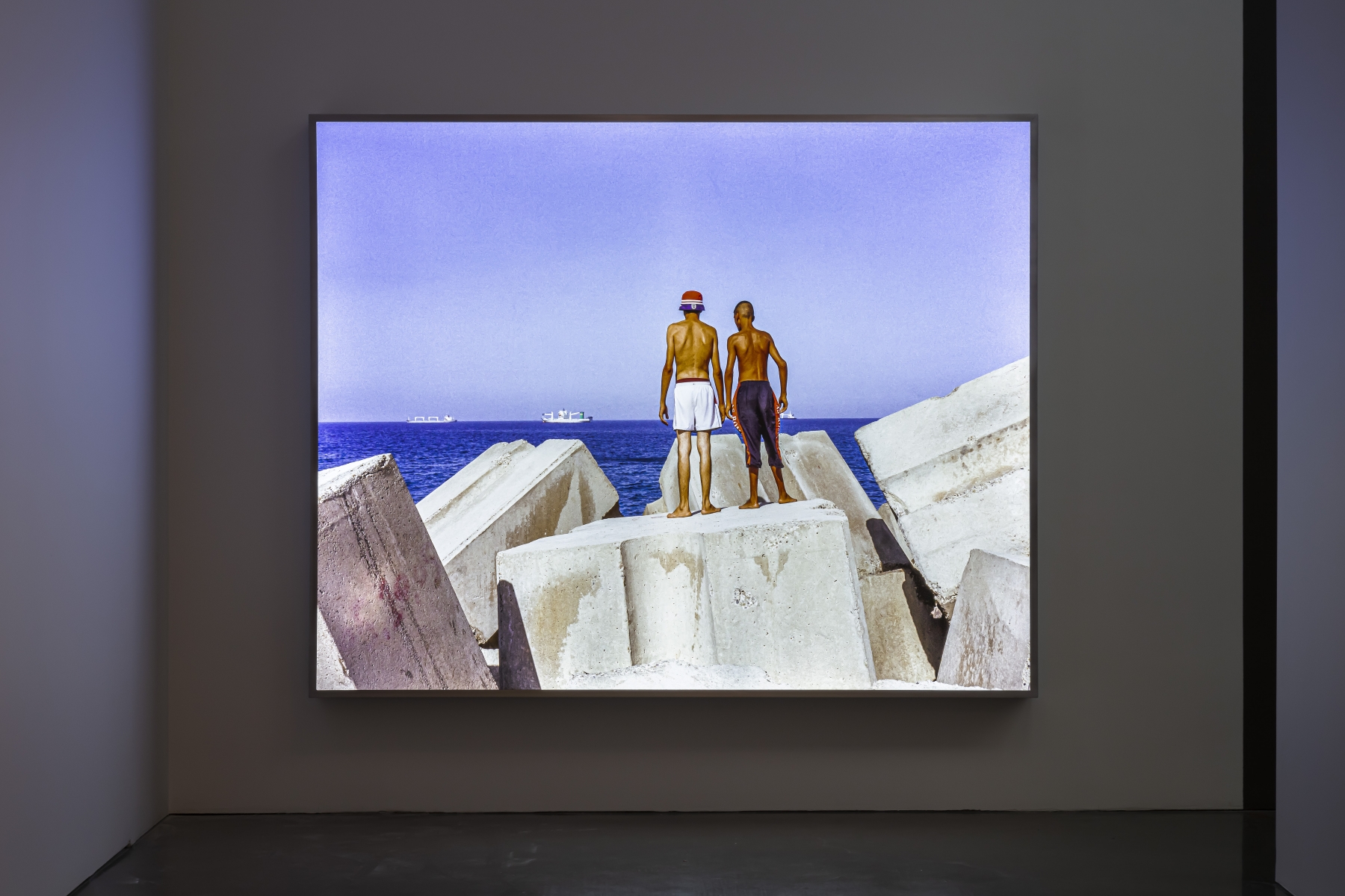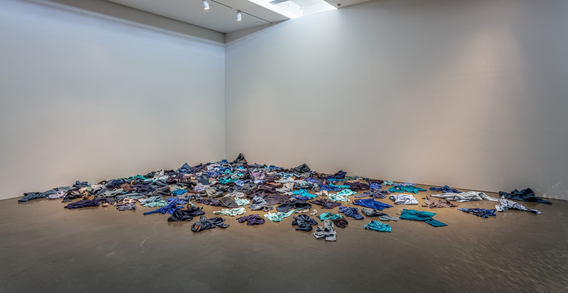 In one work, an illuminated lightbox depicts a pair of boys peering out over the Algerian breakwater into the Mediterranean, implying a connection between the European and African continents that seems to echo over so much of Attia’s work. The infinite expanse of ocean before them—the point of departure for many refugees—embodies the promise of a life elsewhere, emphasized by Attia’s 2007 installation Untitled (Skyline), which depicts a group of variously sized refrigerators entirely overlayed in mirrored tiles. Lit against a dark backdrop, the work produces a mirage of a glittering metropolis while also provoking associations both of consumerism and of basic human need. In contrast to these hopeful scenes, The Dead Sea (2016), a large-scale installation comprised of piles of blue garments lifelessly strewn across the gallery floor, silently memorializes the destruction left in the wake of the migrant crisis.