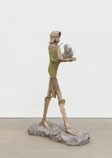 Also on view are a body of new sculptures The Blood Drop, The Water Drop, The Pearl Keeper, and The Berry Keeper—each depicting androgynous bronze astronauts (the knights of our modern world) crouching among the scaly coils of serpentine dinosaurs. They wear chainmail, sabatons, and delicate glass helmets (rosy pink, glacial blue, yellow, and violet, respectively), handblown by the artist. The reptiles and life-size human figures are physically conjoined, as though they are extensions of the same hybrid being. They are also travelers, moving between the worlds beyond our own, and into the imagery of our own past, otherworldly figures that mix sci-fi and fantasy in equal measure.