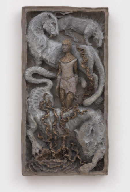 In a series of intimately scaled bas-reliefs, for instance, Appriou’s painterly approach to sculpture is on full display, creating works that call together the varied elements of alchemical studies together and emphasize a range of both archaeological iconographies and mythological elements. In The Waterline (Dawn), a knightly hero floats serenely, eyes closed and arms outstretched, among the waterlilies beside a plesiosaur, one that seems to equally reference the modern myth of Loch Ness and the mysterious creature who supposedly calls it home. The ripples distort the edges of the knight’s body like expressionistic brushstrokes, blurring the boundaries between it and the primordial world, rendered in shimmering purple, delicate green, and gold. Appriou’s work operates along an extended scale of time, merging together a range of myths and bodies in a manner that creates new codes of shared space and awareness, investigating varied modes of understanding history simultaneously. The works are a site of travel and exchange, where these varied constructions and suppositions about the earth’s past are left to marinate and inform each other. With their swirling ripples and waves of bronze, Appriou opens a portal, inviting visitors to journey with him.