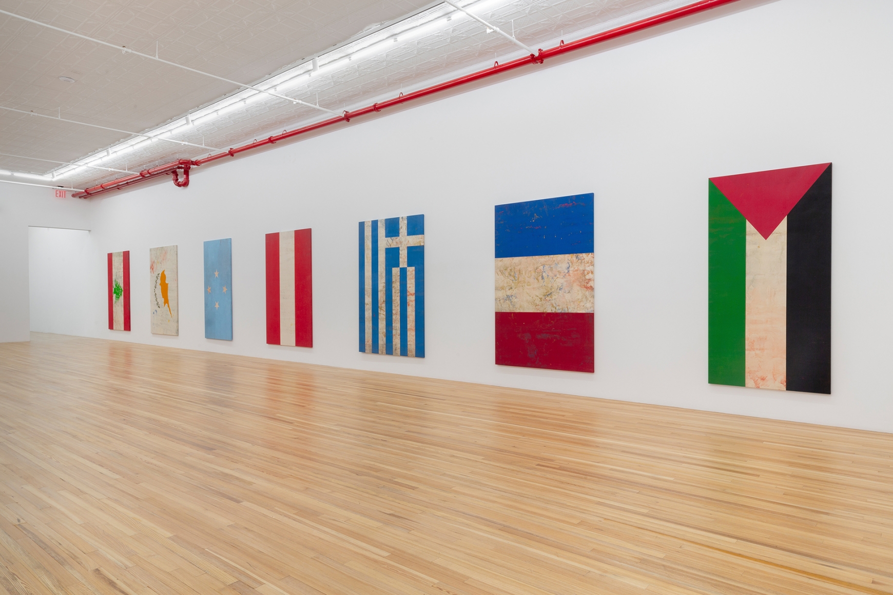 In his essay accompanying the exhibition, Dieter Roelstraete writes: “For all its obvious relevance as a sustained meditation on the vagaries of globalization in these challenging times of worldwide anti-globalist backlash, World Paintings is above all a reflection on the act, and art, of painting. Indeed, if the problem of so much “flag art” (think of every US flag masquerading as a work of art or showing up inside a work of art since Jasper Johns’ Flag) resides in the fact that most of the time we only ever see the flag, and rarely the painting – that the flag inevitably always ends up obscuring (“trumping”) the painting.”