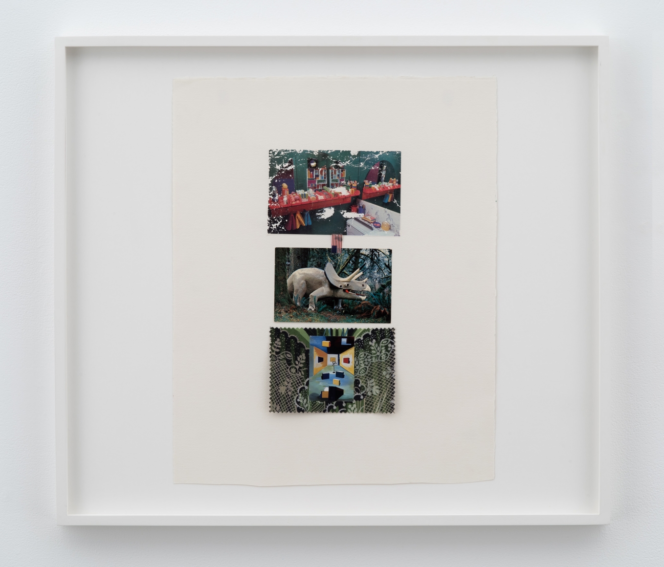 This focus here turns its attention towards the current landscape of American empire, dwelling in particular on the brutal reality of life in a waning American Empire, and reflecting on the progression of history that has ultimately landed us at the current juncture of social and political turbulence. The result are works that span the range of American history. Her works are suffused with images of colonial times: disembodied Pilgrim clogs, Tudor cabins, horses outfitted with blinders, the literal nuts & bolts that prefigured the industrial revolution, Betsy Ross as a dinosaur. The suggestion that America is founded on violence and manipulation, that the post-truth, post-Trump, post-COVID world is not an anomaly but a continuation of a status quo built over the past 400 years, doesn’t seem far-fetched. Other works dwell on the domestic and the interior, like her collages All Fours or Earlobes, Presenting pieces that could be read as portraiture of the American suburb at a microscopic scale, the implicit tension and embellishment of varied elements create an enduring sense of critique that traces itself across the full show.