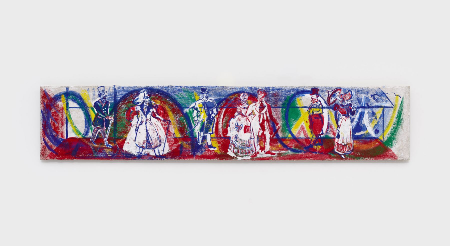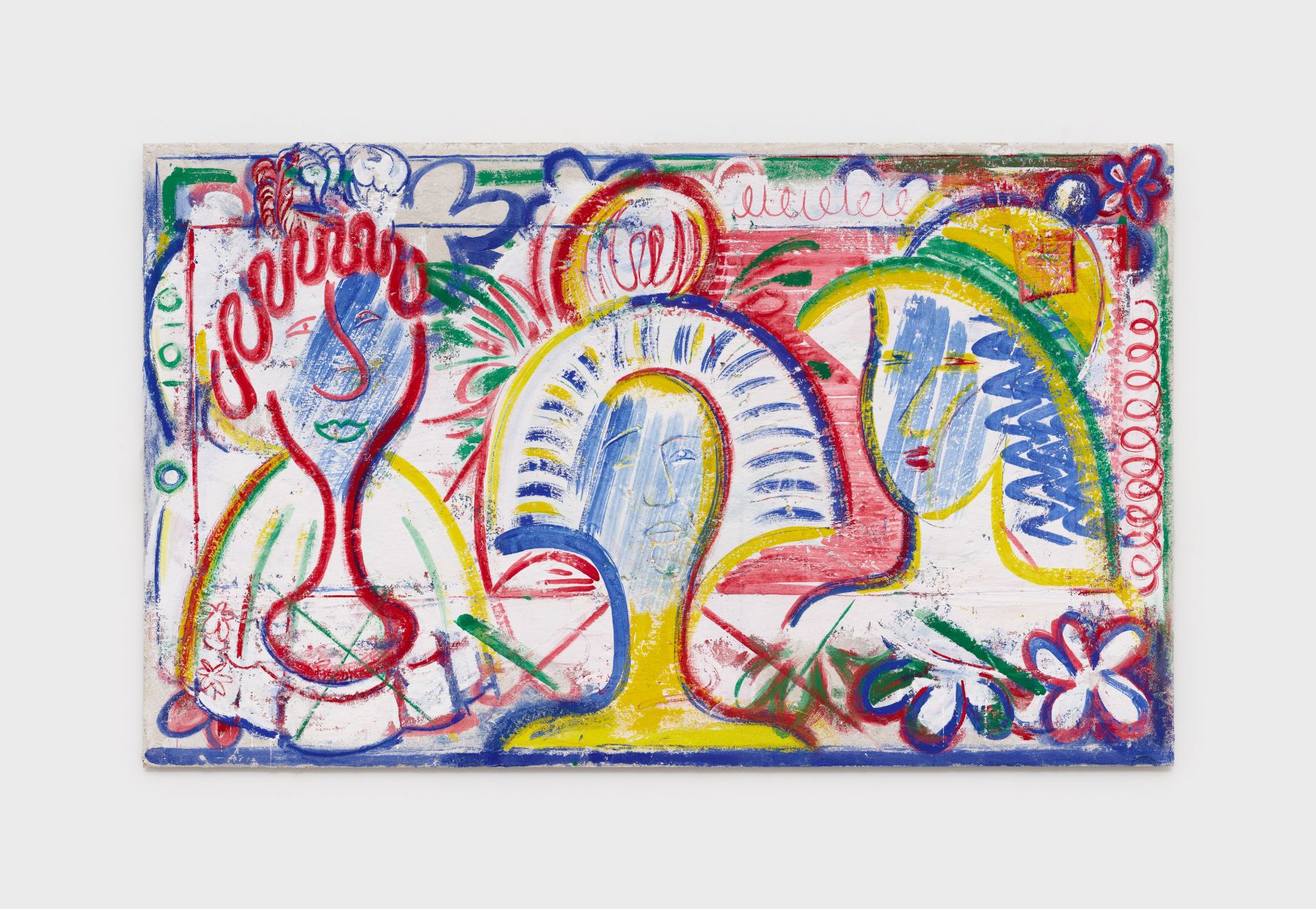 The frescoes on view are presented as an accumulation of gestures and movements, a symbolic order built through painterly wordplay and a complex reference system that delights in subversions and disguises. Elements are concealed or suddenly unveiled, with vessels, frames, and costumes recurring throughout, creating a subtle narrative arc that suggests unseen (perhaps unseeable) truths, carried into being by illusory exteriors, or perhaps a parallel world emerging from this increasingly layered series of meanings and movements. Rosen’s new work builds up imagery in layered constructions that repeatedly reorient the picture plane, painted onto limestone surfaces, which the artist lays like cement, to become facades of facades, finding a new layer of veneer behind every surface.