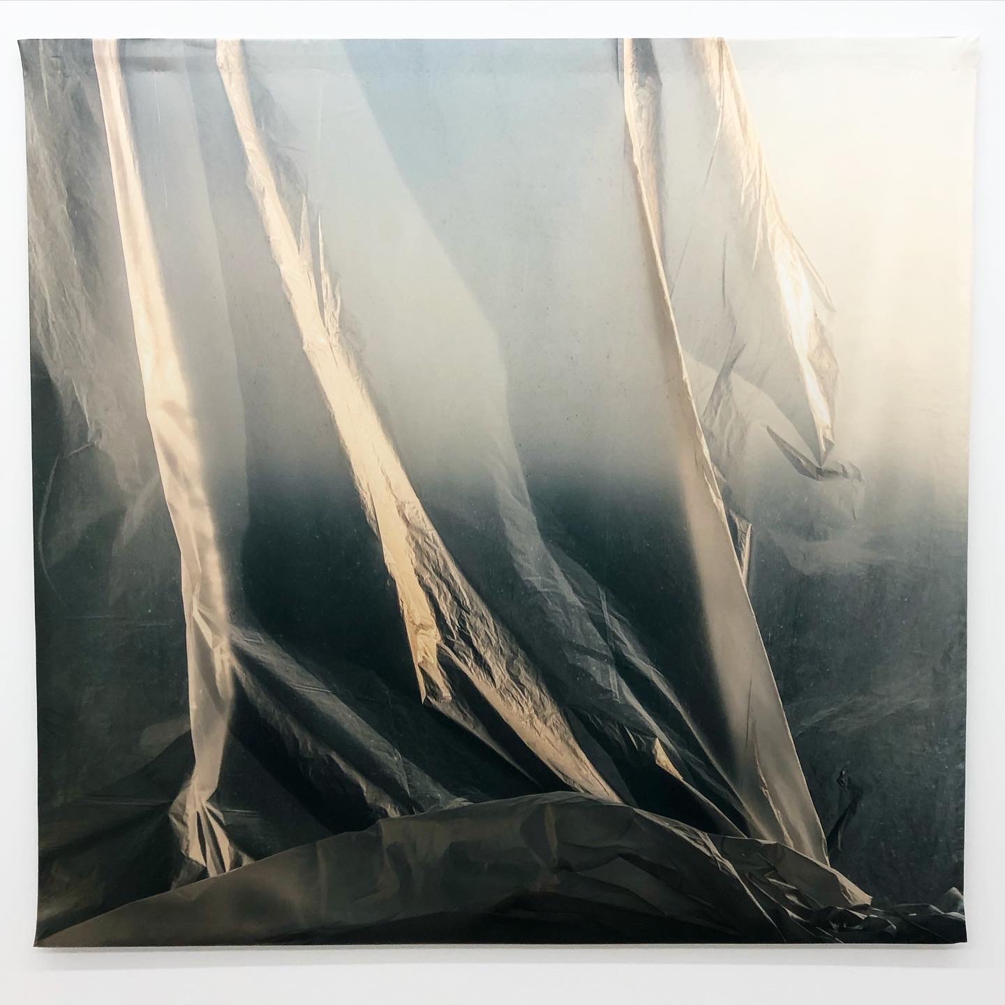 While abstract, the works maintain an intrinsic relationship to the real environment in which Sighicelli made them. The use of lights enable new dimensional and tactile properties within the plastic, and obscured objects show fields of color in the composition.  In turn, the works present a complex layering of space as the dichotomy between a perceived inside and outside is blurred and confused.  Similar to Accardi’s work, the shifting perceptions of depth in each work are reinforced by their medium.  Sighicelli’s photographs are printed directly onto a pliable satin that is suspended on the wall, allowing the material to become a stand-in for what it is intended to represent.  Rather than a direct meditation on material, Sichicelli’s work seems to explore a distanced counterpoint, where the interaction of tensions and spaces is rendered into a flat plane for the viewer’s consideration.