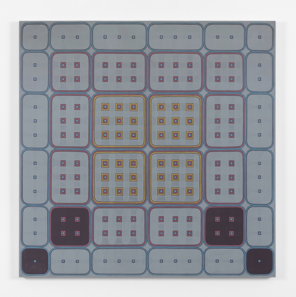 Sensations of repetition are presented here as a sort of meditative act, and repeat that same sense of repose for the viewer.  Walsh has been working explicitly with notions of Tibetan mandalas, and the ways in which these densely structured visual metaphors ultimately can serve both as a space for the clearing of cognitive action, and equally as a map towards transcendence.  “With Tibetan mandalas, you are trying to keep your mind in the present while looking at something. There is a quality of vibration and opticality,” Walsh has said of the works. “Le Corbusier called a house a machine for living. I think of the paintings as a machine for looking, and for seeing.”
