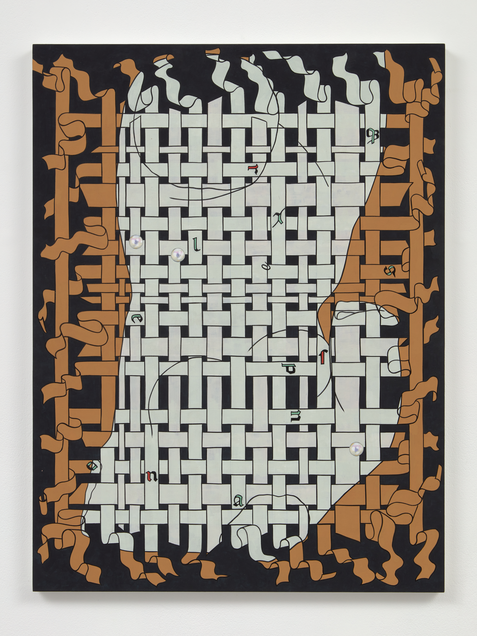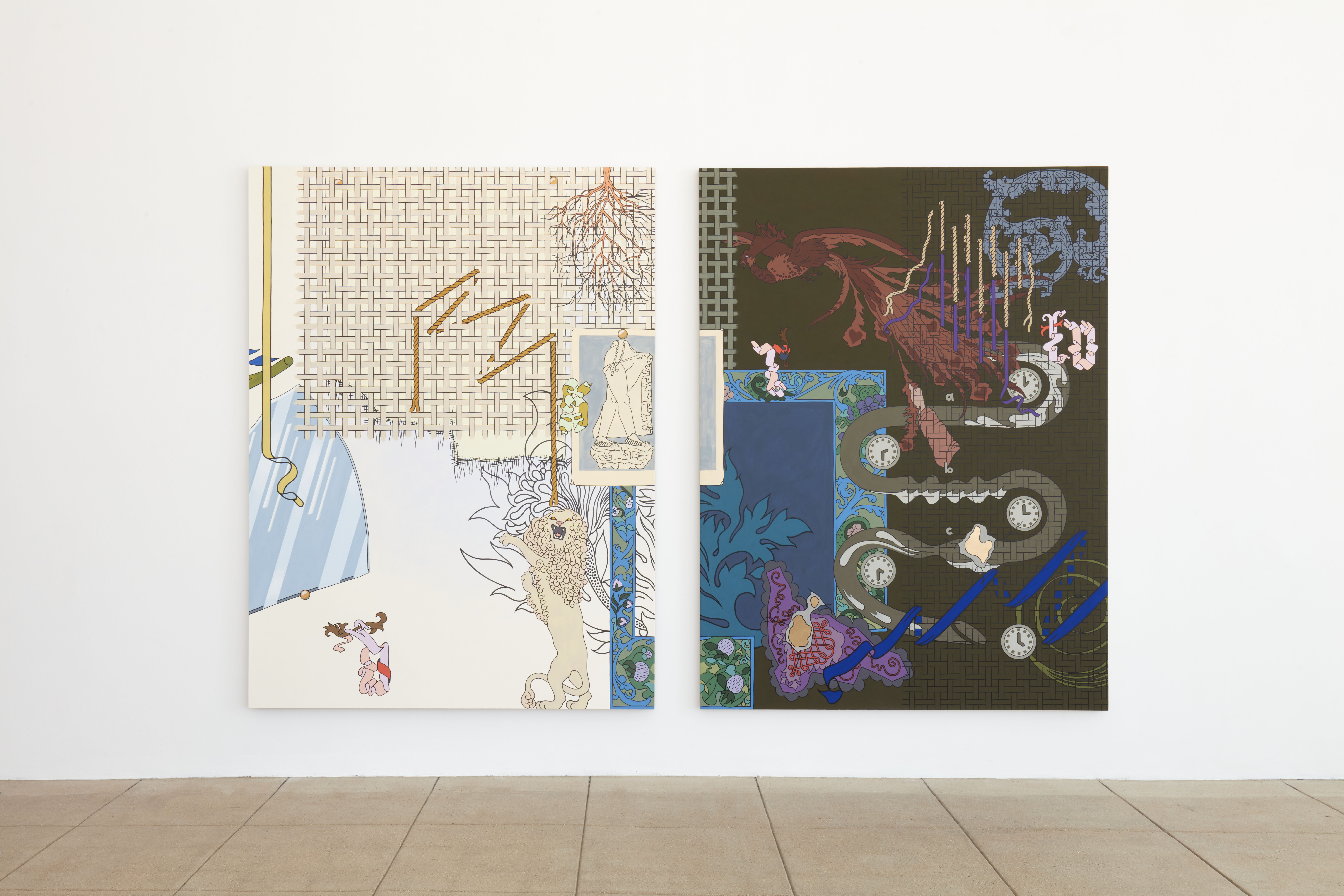 Painter Caitlin Keogh‘s works are orchestrations of symbolism, blending together a range of images and patterns that give the final composition a dizzying series of touchpoints, and ultimately arrive at a final composition that seems to rarely rest on any single image. Such is the case with her new show of works currently on view at Overduin and Co. in Los Angeles, a selection of pieces that emphasize shifting grounds and a composite sense of reality.