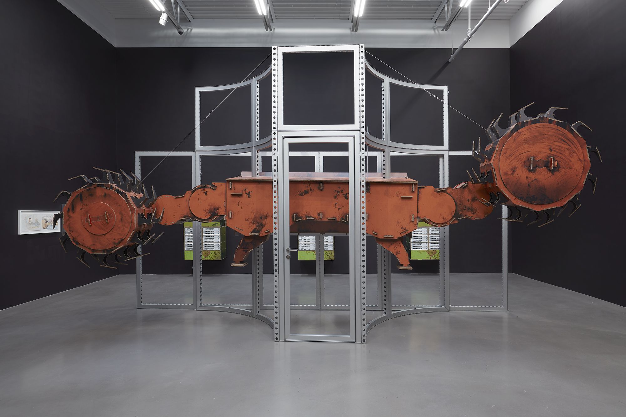 Also presented in the exhibition is Extractor, a playable board game that also functions as a take-home catalogue. Players collect data in the form of tokens, which they must stack on plastic-molded racks and place in cloud services to monetize what they have mined and thus win the game. The hybrid sculptures-cum-display units presenting the boxed games mirror the dynamics of the monopolistic platform businesses that control much of our internet infrastructure. Compiling data and economics together, Denny’s artwork raises questions about the effects of further automation on the limited jobs still left in increasingly mechanized sectors such as mining, service, and logistics. What happens as the labor force shrinks in these traditional industries? How will individuals and worker communities dialogue with those in power in the future? Where will the leverage they once brought now come from?