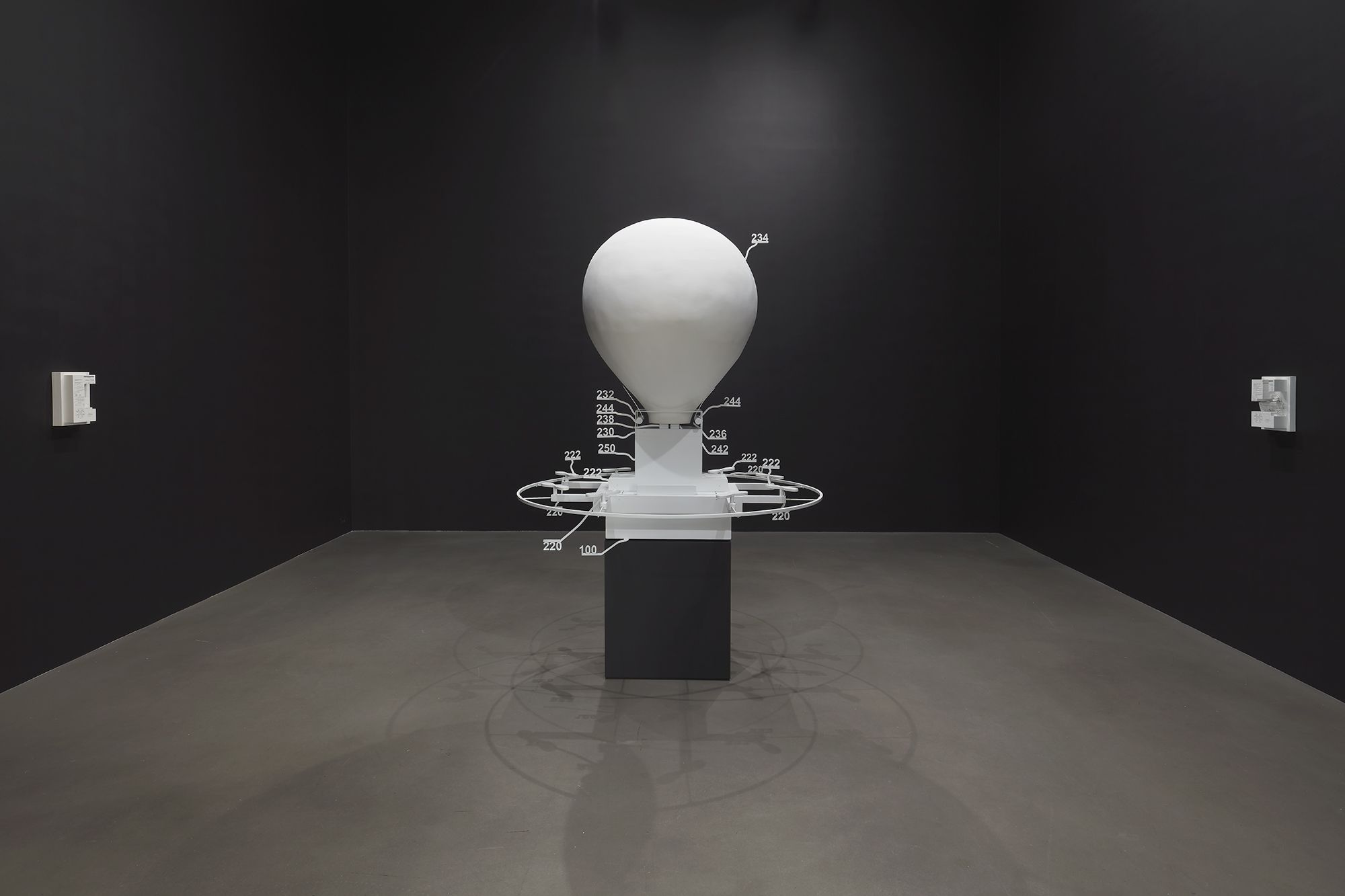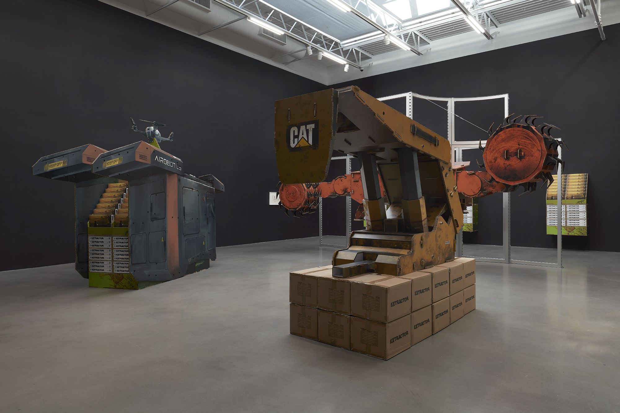 Focused on the interconnections between data mining, mineral mining, and the mechanization of labor, Mine brings together a collection of recent works including several large cardboard sculptures imitating giant automated mining machines; a series of wall-mounted paper reliefs and printed vitrines; and a new Augmented Reality sculpture based on a 2019 patent drawing filed by Amazon.com for a delivery worker replacement drone. A hot air balloon referencing the speculative flying machines of earlier eras, the work is a peculiar rendering of a printed diagram in three-dimensions, serving as a platform for the projection of an animated AR model of a revolving, rocky, mineral-rich, planet Earth onto the drone’s balloon bulge. This vision of Earth-as-resource is borrowed from the advertising materials of one of Amazon’s most prominent data services clients: the multinational mining group Rio Tinto.