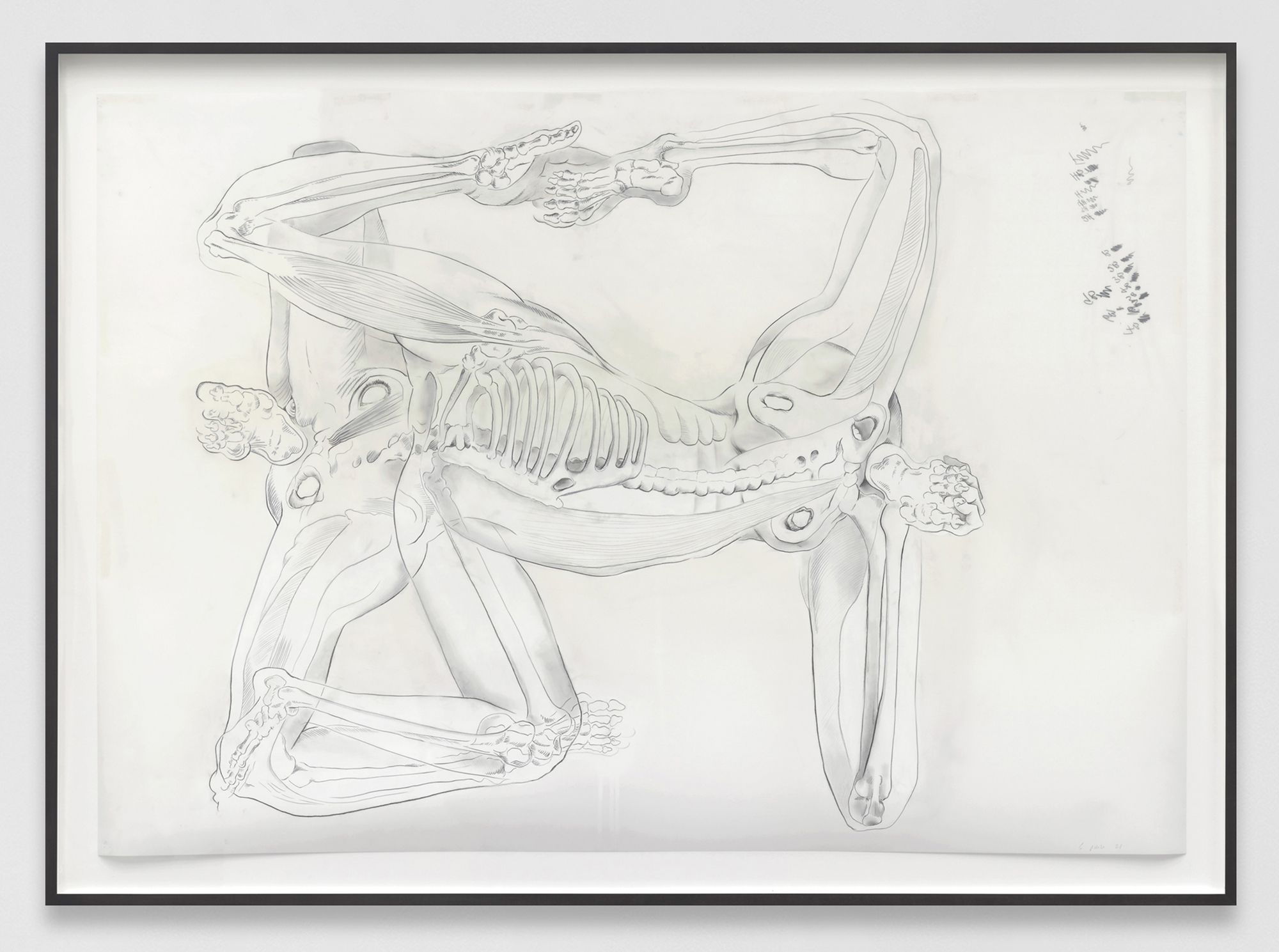 There’s any number of points of entry here, and a range of artistic touchstones to explore. There’s Pieter Schoolwerth’s  subtle models, which he uses to construct his dense, multi-layered works incorporating imagery from a range of photographs, drawings, art historical iconography, printed materials, and pop culture references. Much like a maquette, the pieces take on a flattened sense of the same conceptual honing, using the artist’s process to arrive at the final objects. By contrast, Seth Price’s new drawings, a rotation of gouache, pencil, and enamel mix on paper and Mylar present  bodies in cross-section, almost cartoonish appreciations of the disparate elements, almost as if he had reversed both subject matter and concept, deconstructing the body down to its bare elements.