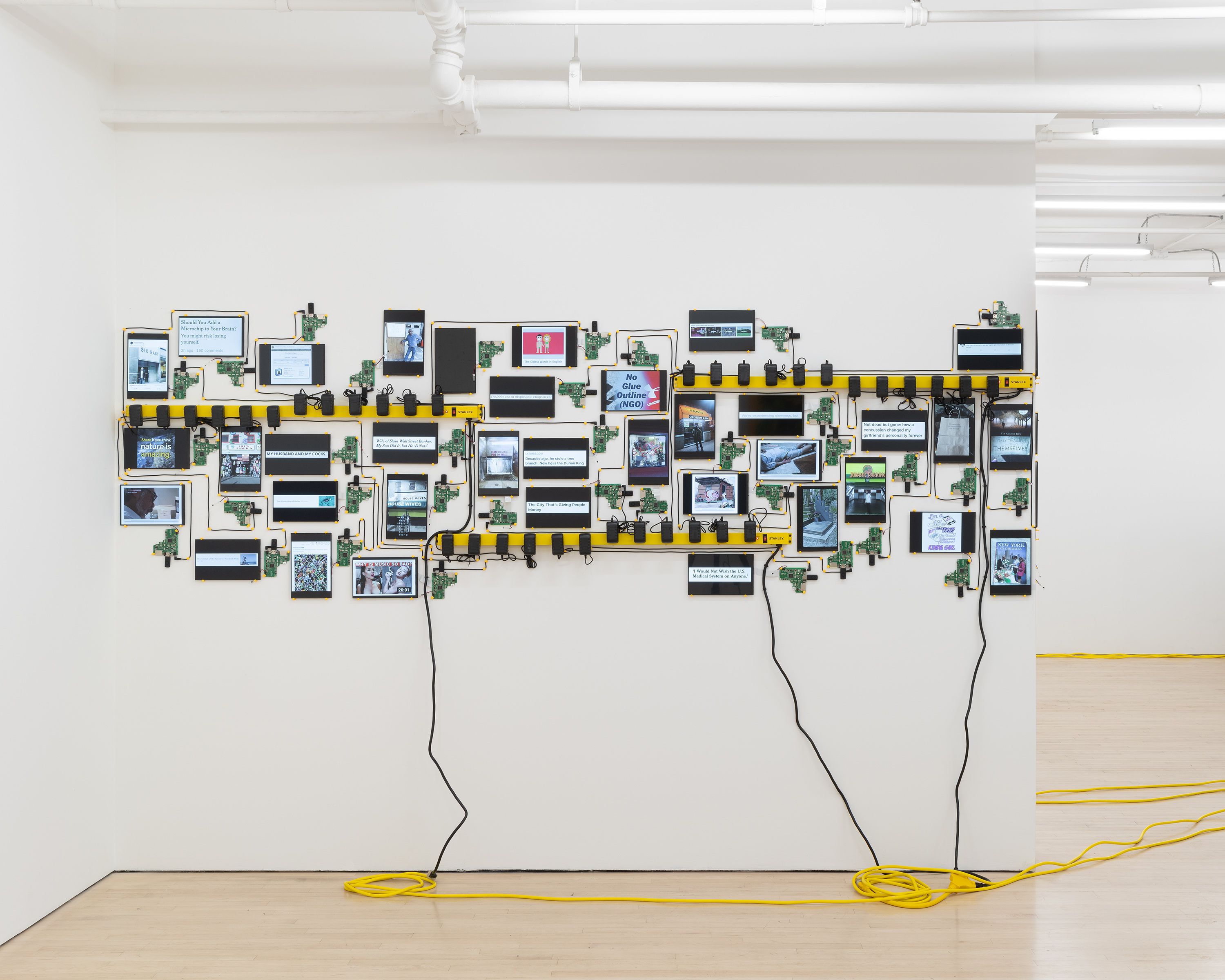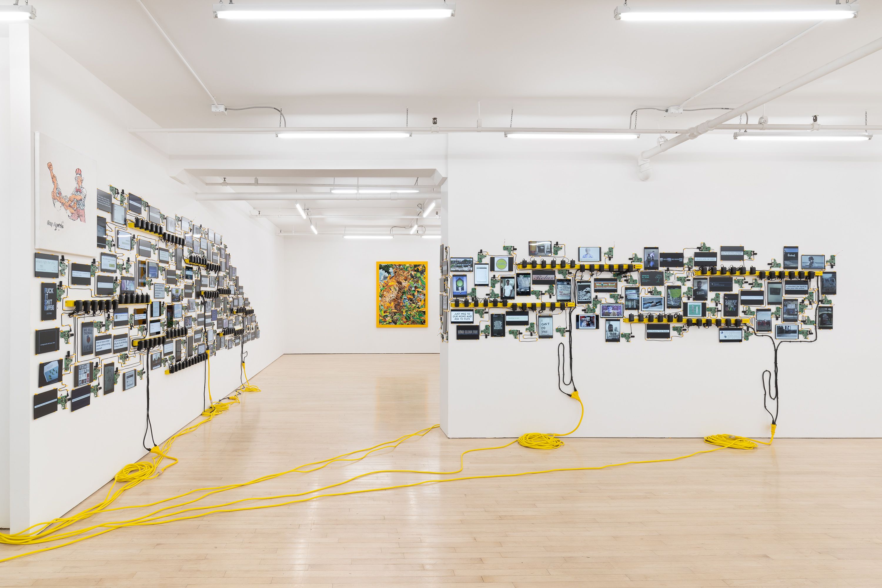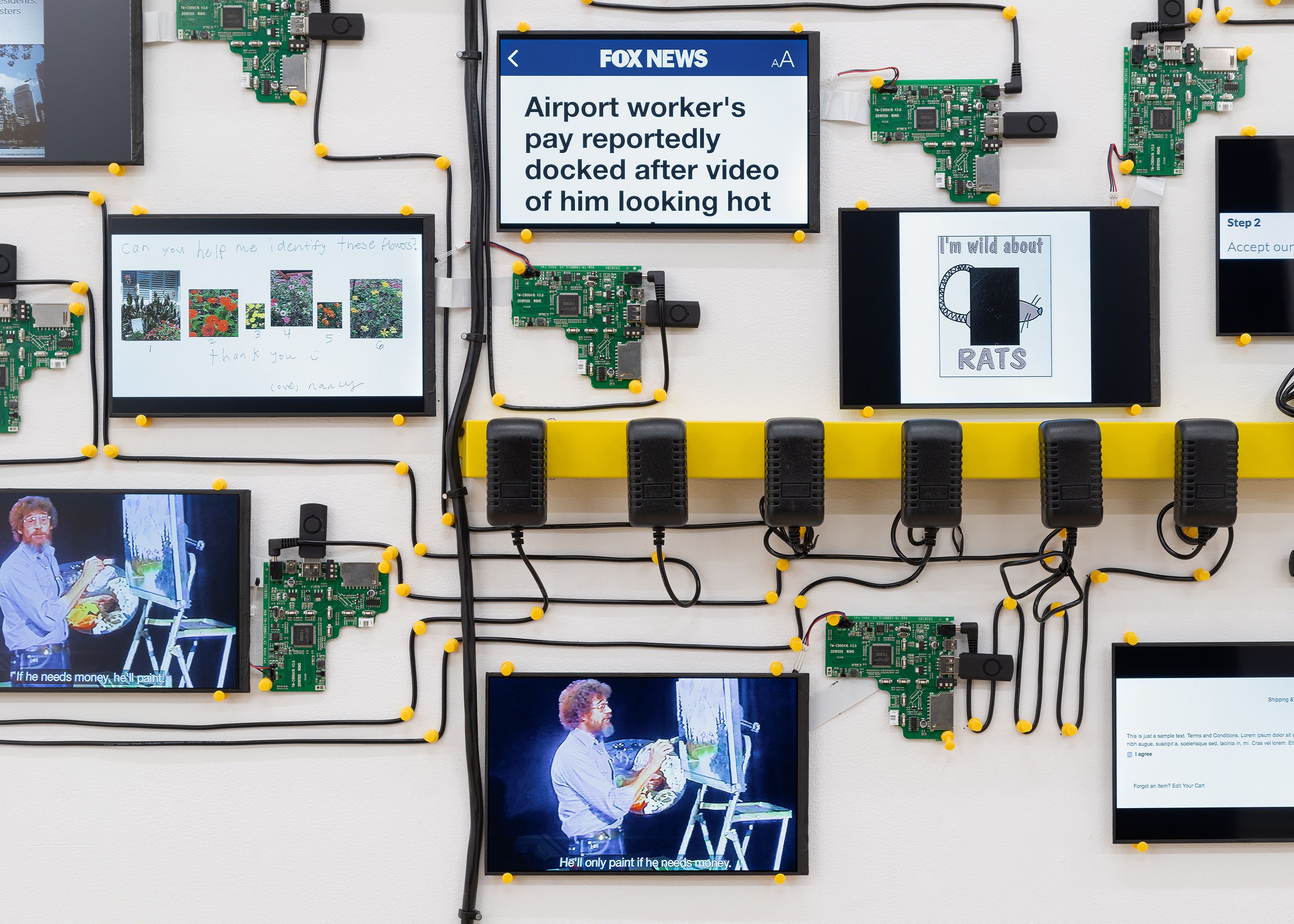 The other major work on view, Year in Words 4 (2021), spreads across the gallery, a series of LED Screens dotted with memes, photos, news headlines, and other fragments that speak to the volatility and violence of the past year. Drawing on the modern language of click-bait news, easily digestible writing, personal photos and memes, the image creates a dense collage of signifiers and symbols, a fitting counterpoint to the collages nearby. Here, treating these fragments journalistically, the piece becomes a fitting reflection of a year that has so often felt floating in uncertainty, waiting to return to a normal that never felt quite right to begin with.