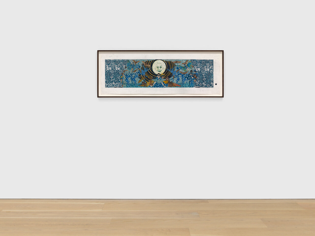 Dzama’s work walks a peculiar line between historical study and subtle conceptual arc, alluding to the rare convergence of recent lunar events, including a so-called super blood moon and a blue moon. Other works present delicately colored underwater vignettes of seahorses and marine flora and fauna undisturbed by the world above. For Dzama, these fantastical compositions of familiar yet far-off, enchanted worlds respond, in part, to the universal experience of isolation during the pandemic, and a sense of wanderlust that many experienced while in lockdown.