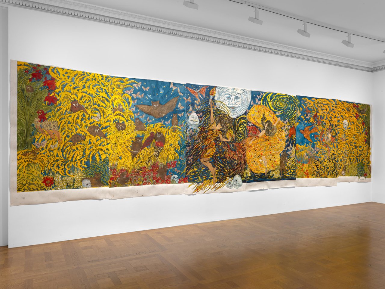 One piece, a large six-part work on paper, measuring over twenty-five feet long, which Dzama first debuted at his 2021 solo exhibition at the Savannah College of Art and Design Museum of Art, Georgia, is also be included in the show. Similarly influenced by the plant and wildlife Dzama encountered in his travels, this massive work offers a view into a lush environment filled with bats, monkeys, and butterflies, as well as dancing figures, a beaming moon, Humpty-Dumpty, and several skulls, which serve as somewhat sinister memento mori among an otherwise jubilant scene.