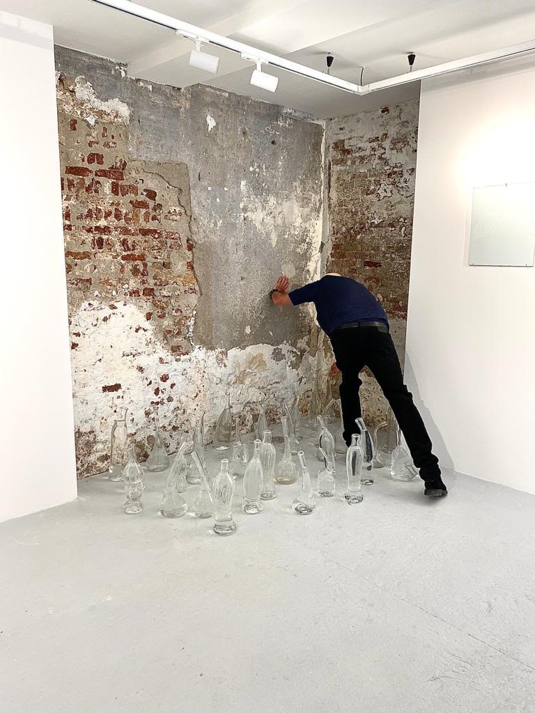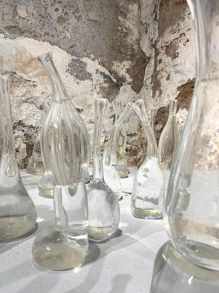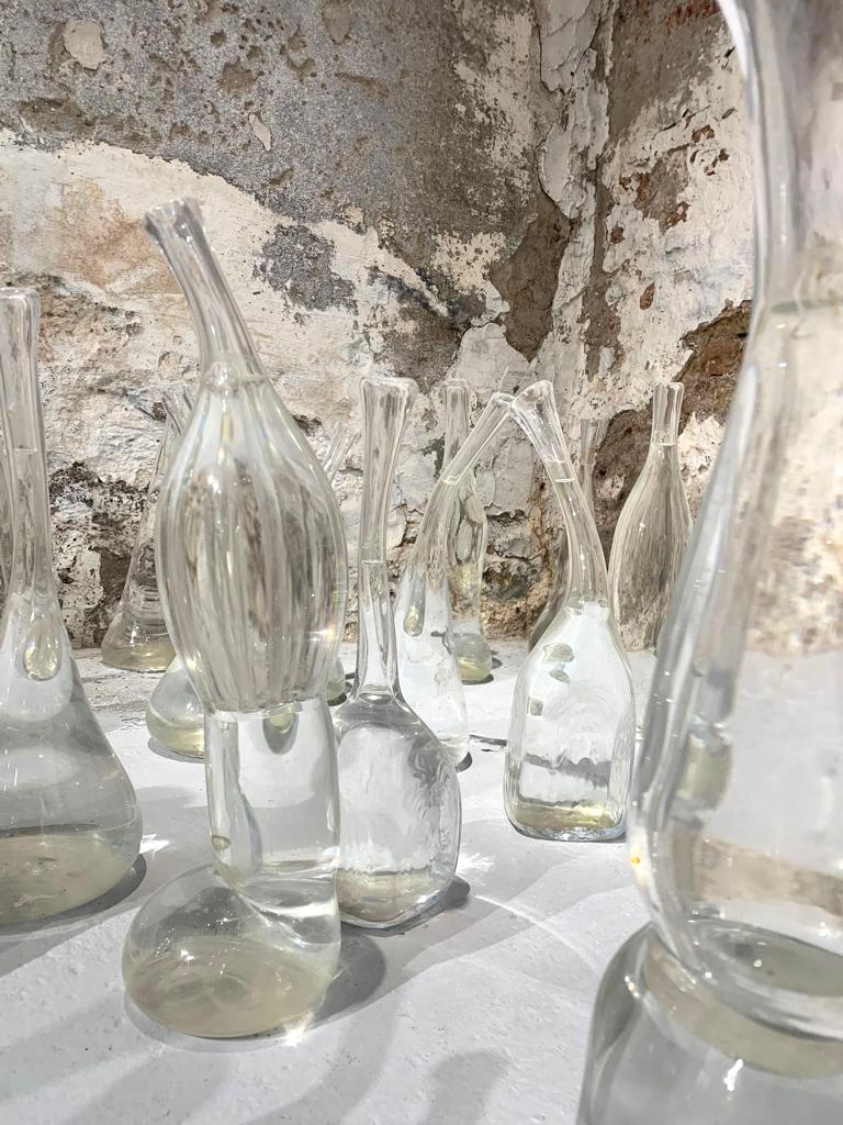 Other processes of morphology can also be found in this show, such as the blown-glass bottles of Val Sinestra (2019). For this exhibition, the bottles are brimming with Venetian lagoon water. This work reconciles, in alchemistic ways, the representation of ice with its other form. As the winter solstice nears, the dichotomy of water within glass is altogether timely. The staging of a transformation that is to come when the show closes and the water is, presumably, re-poured into the canals. Should this year bring the incredibly rare phenomenon of the canals freezing (recorded only twice in the auspicious years of 1929 and 2012), Vital’s prophesy in glass, as I see it, may be realized yet.