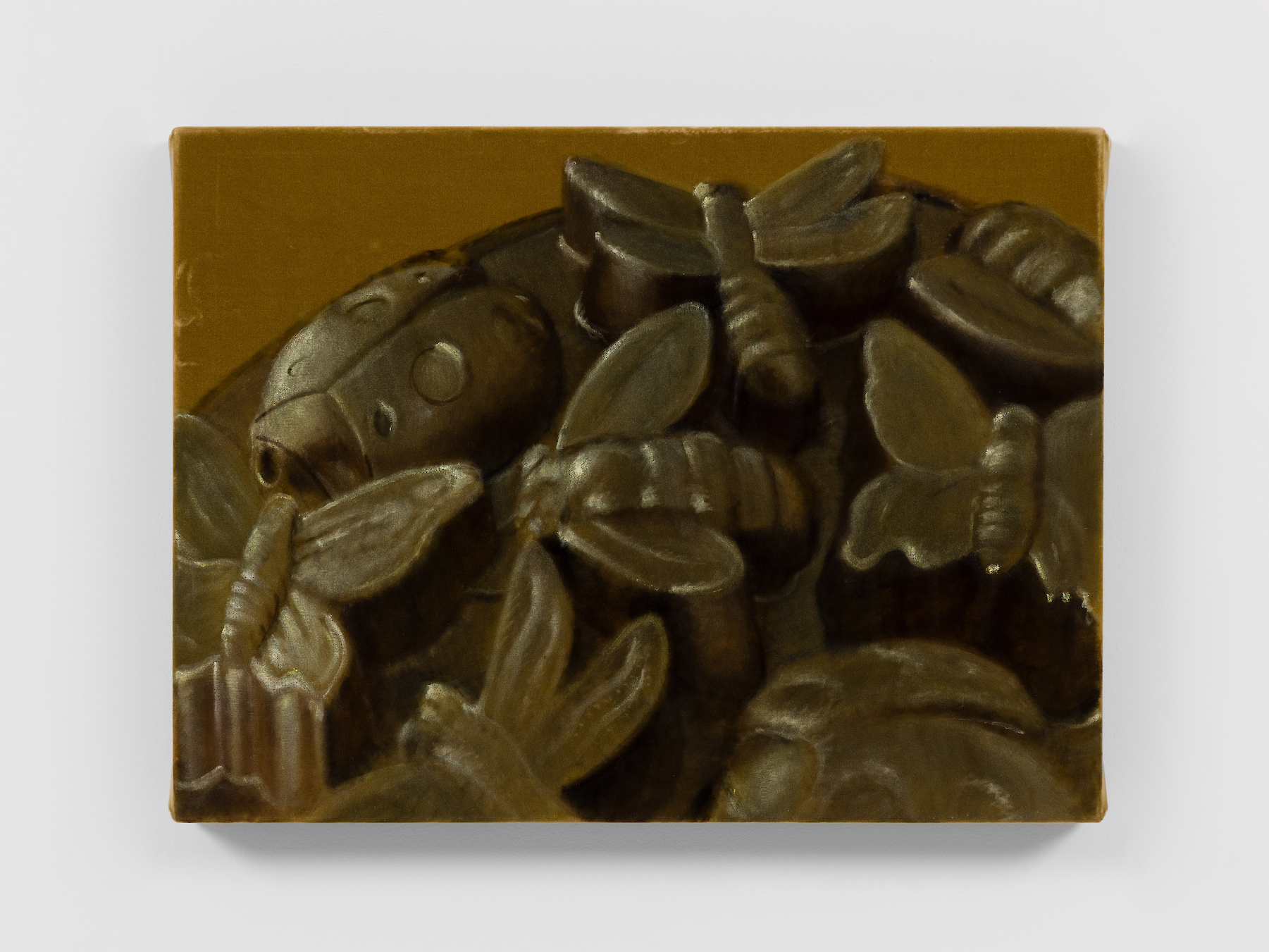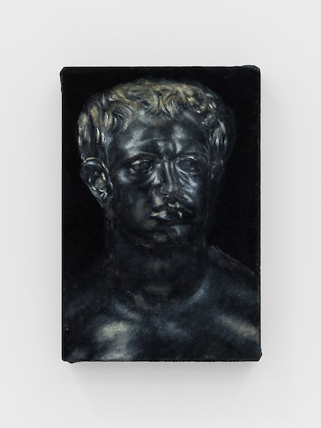 In other works, Wood takes on a more express study of single spaces and objects, like Nero oh, which depicts a bust of the Roman leader as a more subtle negotiation between portraiture and its abstractions. Rendering the bust in a deep, dark color palette, the work gives a sense of foreboding and ominousness, holding back easy readings of the image as if it were bathed in both literal and figurative shadow. Another, Study for jelly, makes unclear connections between a clearly synthesized surface depicting a series of bugs, and the object’s origin. Throughout, Wood mines this tension of subject and origin, leaving the viewer little space to grasp at connections, and turning the works into an otherworldly experience of looking.