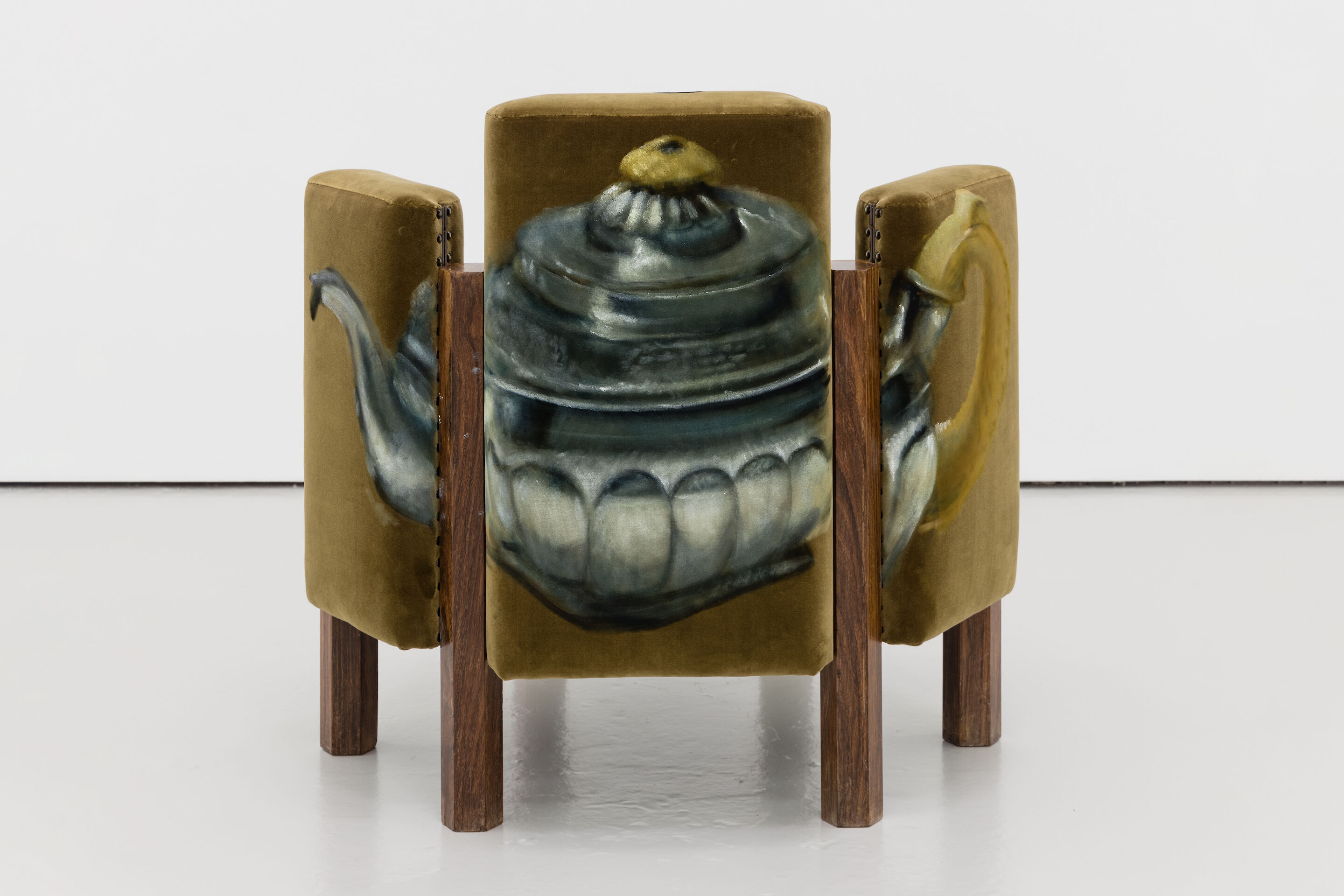 The show, which opened this past week at the gallery’s London exhibition space, makes for a fitting elaboration of the artist’s work, moving across a range of canvases, as well as painted furniture sitting in the middle of the gallery. Wood’s particular approach to painting, using thick layers of oil paint to create images that negotiate a line between the surreal and the tradition of the still life. Unifying this particular body of work is a fascination with proximity, posing images in close focus or cropped views of larger spaces. In one corner, repeated stalks of asparagus are posed against a red leather overcoat, the canvas split down the middle to present both, while a close by work splits the canvas into triplicate, posing fabrics, silent figures and a car interior. Space and material are posed together, forcing the viewer to balance questions of depth and proximity, closeness and intimacy with a sense of loneliness and abstraction. This split awareness reaches a high point in What if you showed up, a work that sees the artist spreading a series of compositions over the surface of upholstered chairs, turning this same sense of juxtaposition into a three-dimensional totem.