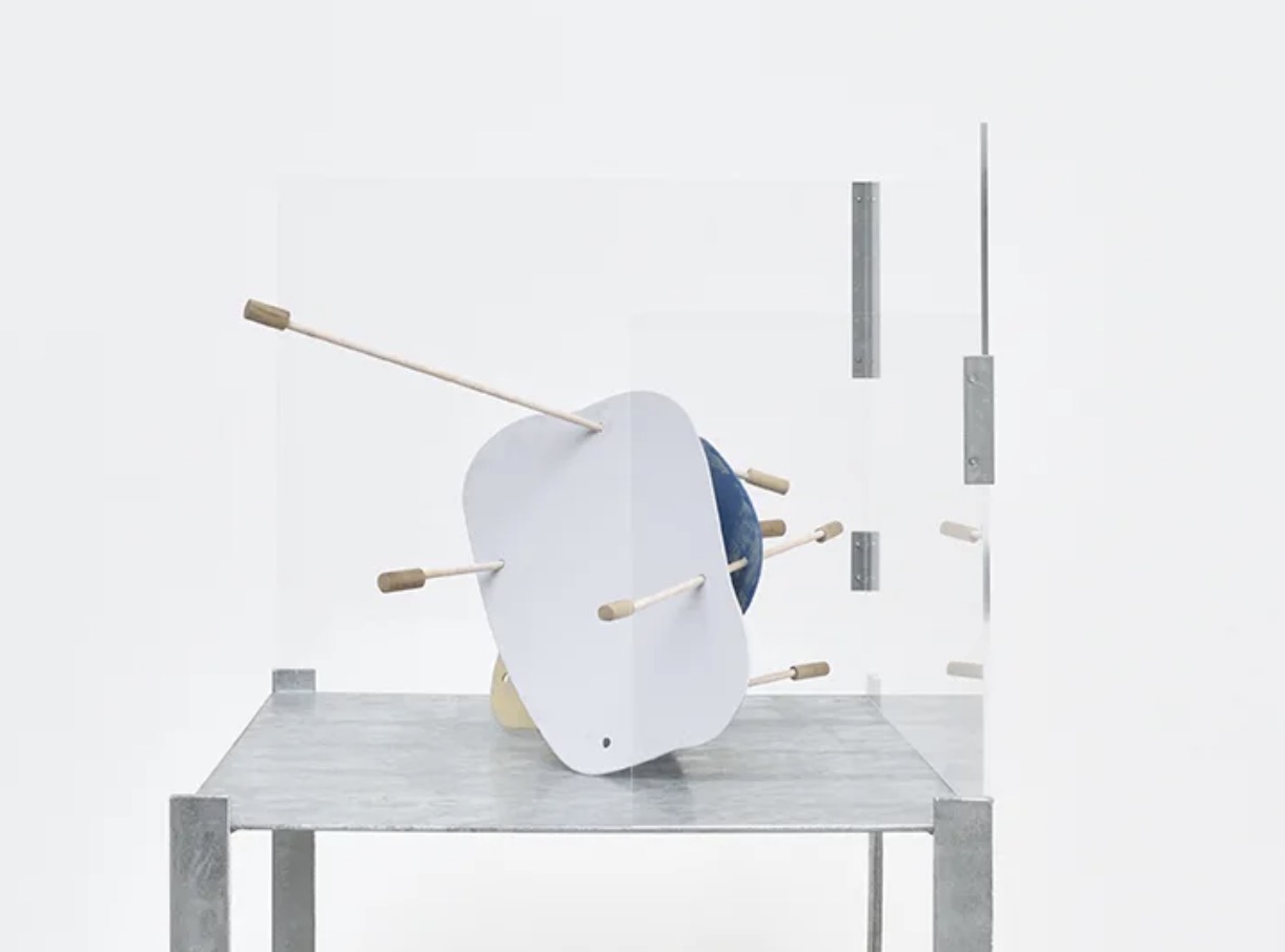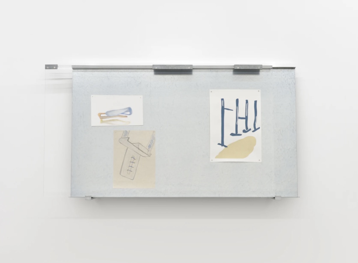 In conjunction with her sculptures and installations, Baghramian has throughout her career produced significant sketches, drawings, and maquettes, known as Side Leaps. While conceptually underpinning her large-scale sculptural works, and compared by the artist to her studio tools, these sketches, drawings and maquettes are periphery studies for sculptures that will never exist. In Baghramian’s words, the Side Leaps ‘have not been allowed to become sculpture’. As such, they provide intimate and invaluable insight into the artist’s working practice, becoming as consequential as the realized sculpture. For this show, the Side Leaps here take on a sense of sculptural fragments, materials and moments in space that the artist often orchestrates into larger spatialized arrangements. Blocks of plexiglass and metal are presented in quiet repose, while in other spaces, these materials are used as mounting platforms for drawings and sketches, combining each of her inventions and explorations as a small-scale maquette, or proving ground for her larger pieces.
