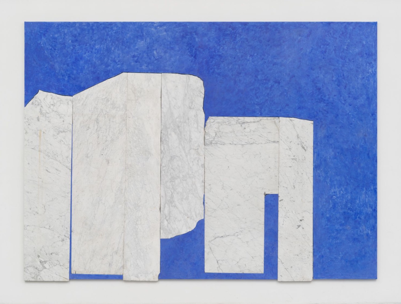 The works on view mark an extension of a group of intimately scaled pieces Moyer produced under the limitations of the Covid-19 pandemic, and were created with the the gallery’s exhibition spaces in mind, scaled up to emphasize inherent conflicts in their scale and materiality through arrangements of stone, marble, and slate within expanses of painted plaster or, in some cases, merely balanced precariously atop. The work seems to defy the laws of physic, or break from the confines of a frame, giving these hulking slabs of material a strangely evocative and urgent quality.