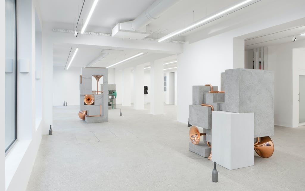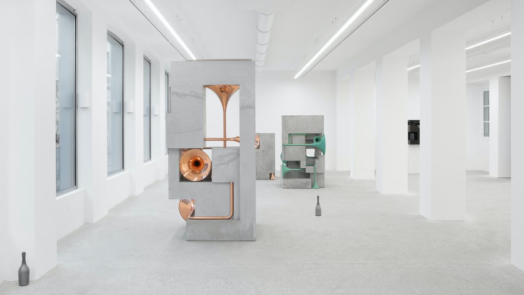 Time, space and the concept of reality are inseparably linked in Kwade’s work, and her work has often used its physical arrangement in space as a facet of a more complex relationship to time and the body. Alchemical in vision, her constitutive components offer the eye is a physical reality in its own right, a process of transmutation that steers clear of the mythical, and instead lands squarely on the shoulders of a scientific delving into the nature, or rather, the atomic composition of her subjects. In a number of works, the artist arranges a series a series of horns (or funnels) in concrete blocks, creating subtle alterations of her materials in pursuit of a surreal final result. Yet the works remain traceable in their composition, rather than appearing as some truly otherworldly object, and the past contexts of her materials always remain clearly in view. Alongside these works are a series of small bottle sculptures, a motif that brings to mind past works in which the artist presented vials containing the constitutive elements of human chemistry. Again, Kwade’s work seems to work by allusion, calling back to these elemental forms in both a history of science and one of her own work.