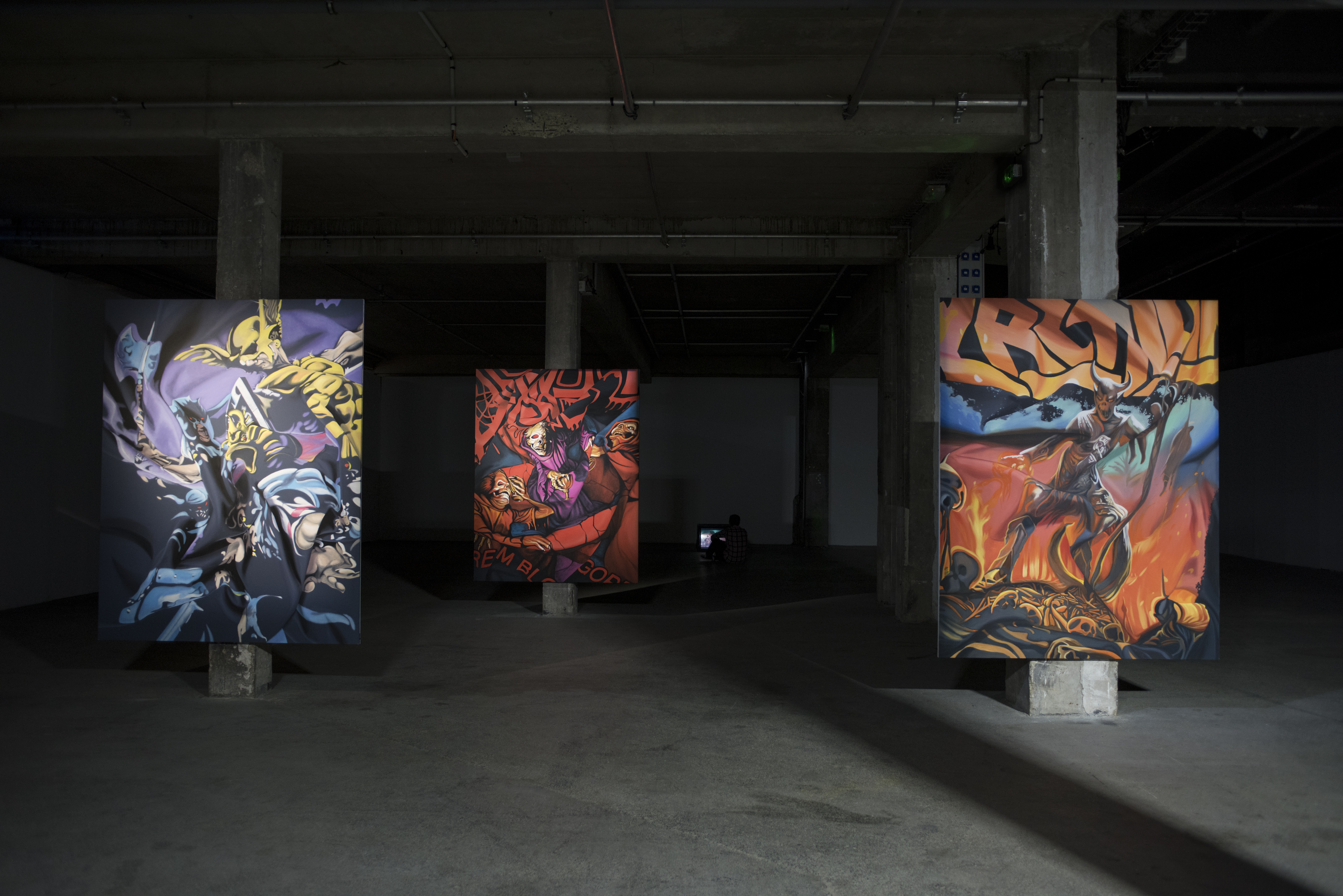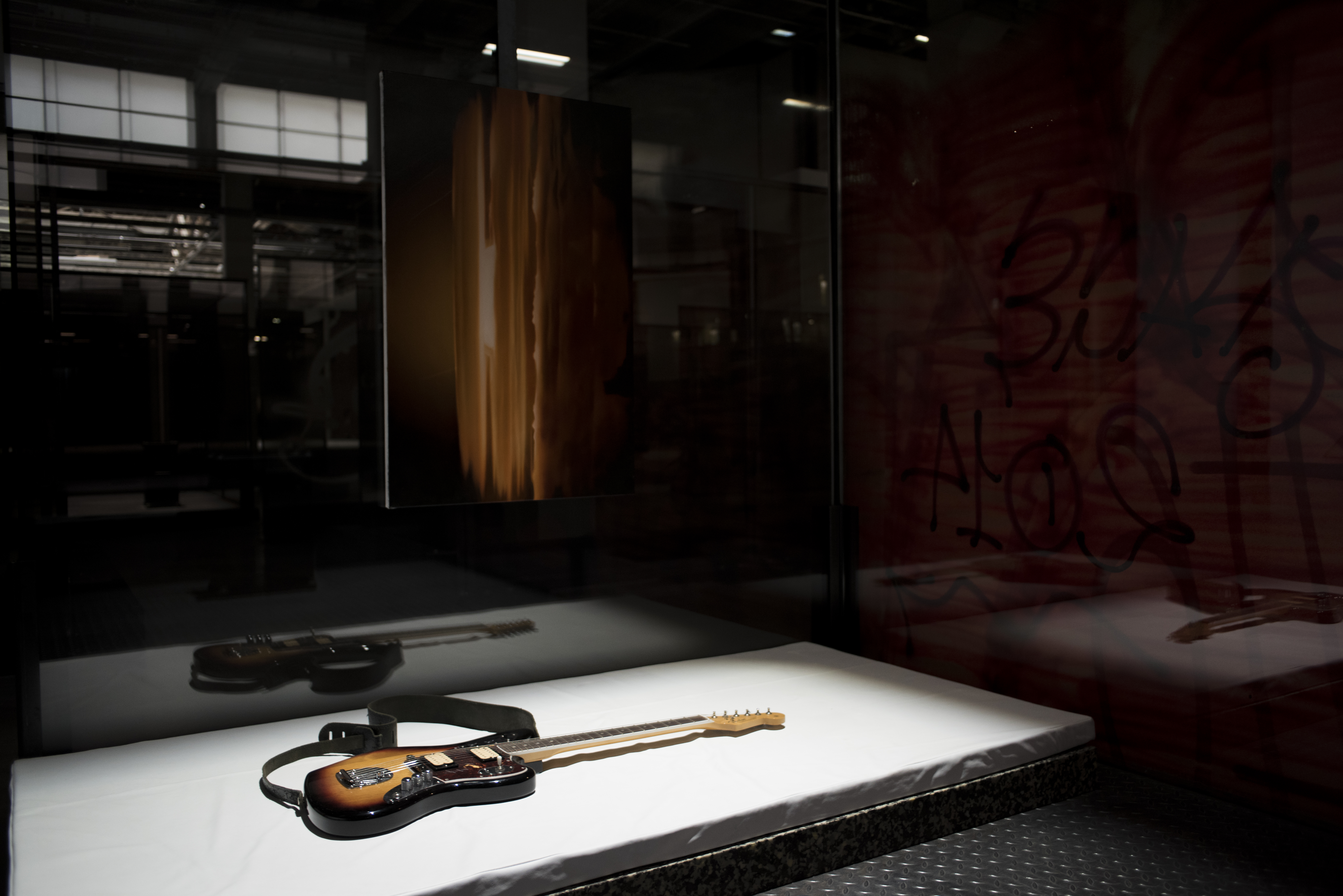 As part of her intervention of the exhibition space, Imhof stripped the walls and ceilings, exposing the concrete columns and revealing the museum’s underlying structure. By peeling away the layers of its history and returning it to a state of modern ruin, Imhof turns the art institution into an aesthetic extension of her work. The show recreates a post-industrial atmosphere that is reminiscent of nightclubs in Berlin and the abandoned liminal urban spaces which outsiders inhabit. The museum becomes a ‘complex’ of activities and passivities, reflective of the disparate forms of sociability and communication— a space where thought and desire are integrated and mirrored back to the audience.