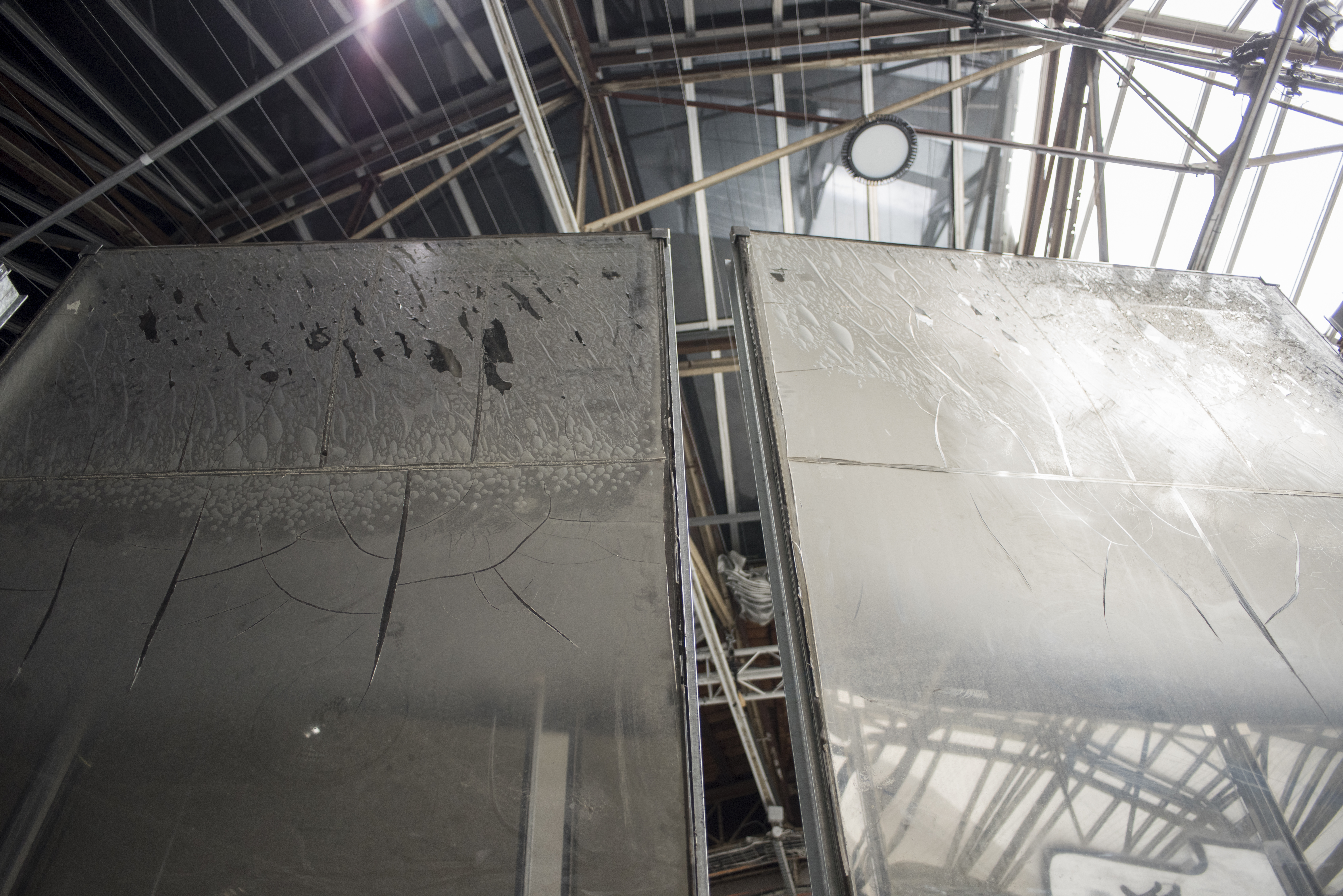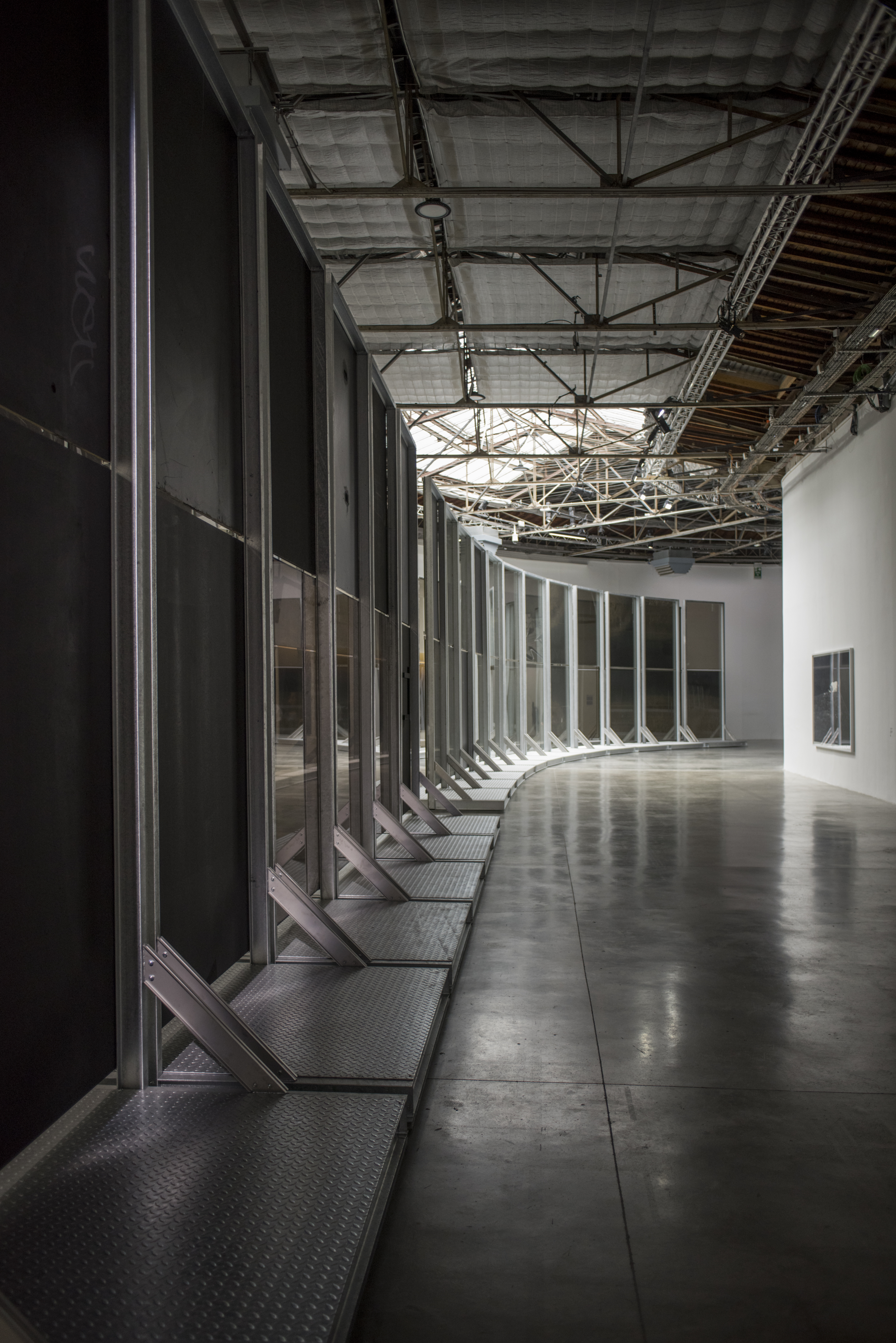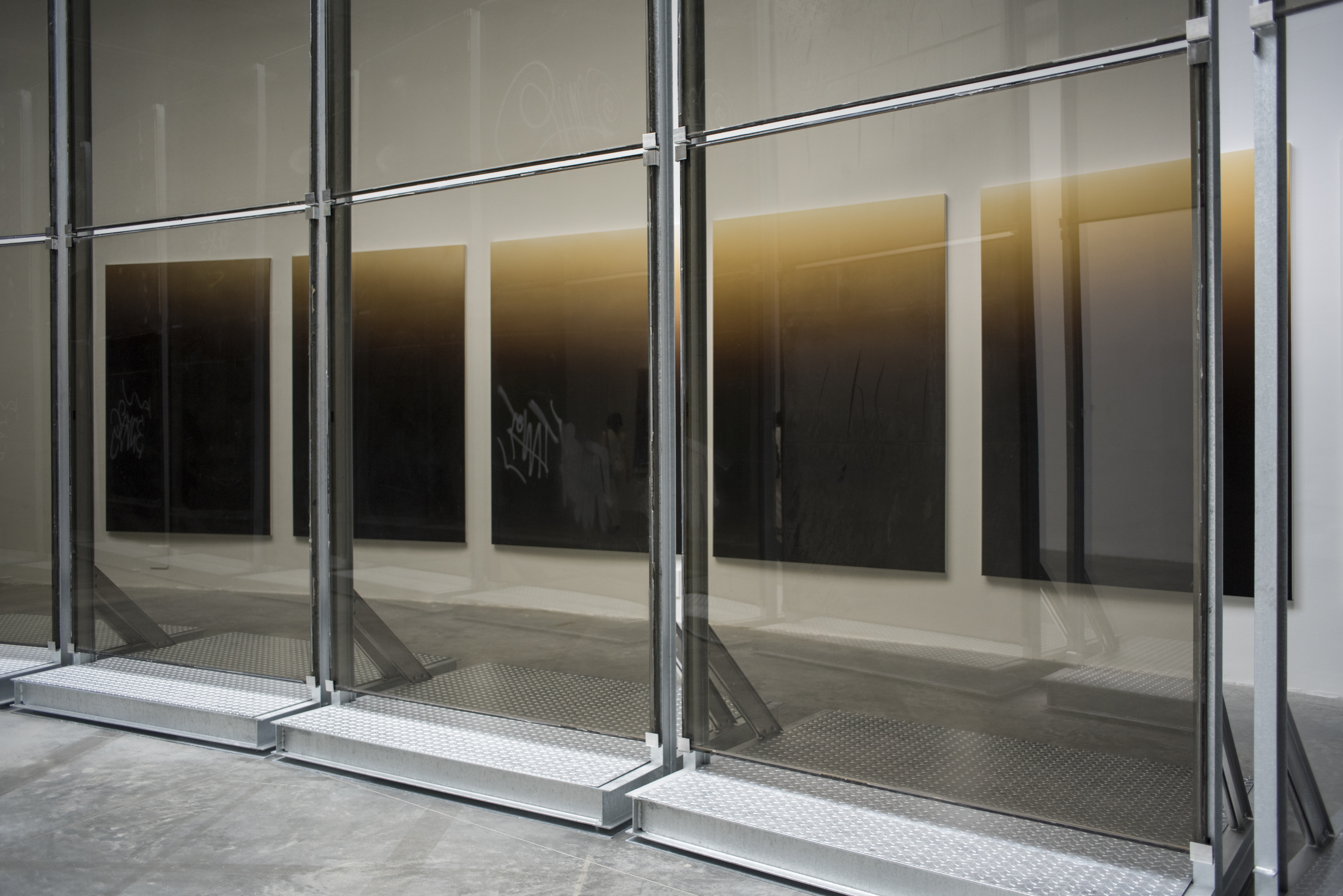 On the first floor, two rows of towering glass panes—salvaged from an abandoned 1970s office building in Turin—are arranged in a curving pathway. Tarnished and opaque, some of the panels still display their original graffiti. Descending to the lower levels, the viewer is plunged into an alter-reality of the underground. Parts of the space are sectioned off with wire fences much like the ones cordoning off industrial parks. Tall smoked-glass panes are arranged to create a grid-like maze, evocative of streetscapes. The glass panels play with reflections and transparencies, shadows and apparitions, paralleling the ambiguity and anonymity of urban life. Walking through the subdivided space, the effect is one of isolation and distortion. The compartmentalization of the museum space becomes, in effect, a physical representation of the alienation that characterizes our present age.