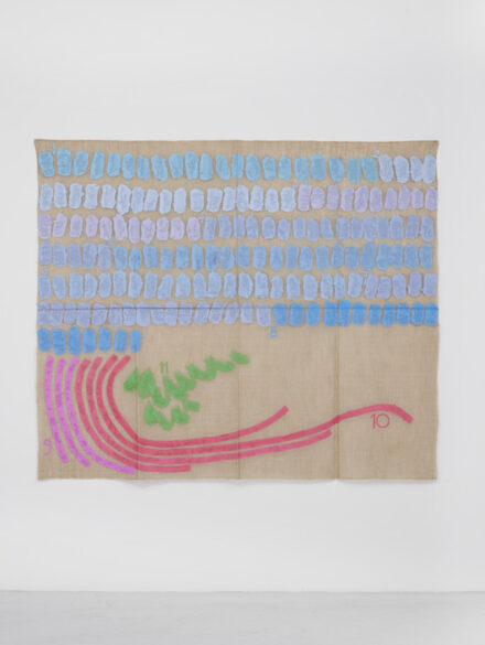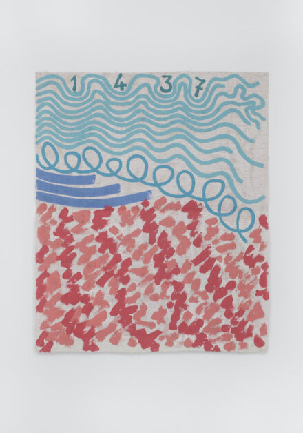 Held in tension with meditation and improvisation, the canvas is a study of the transitional space between the known and unknown worlds, yet draws on simple gestures, numbers and marks to create enigmatic reinterpretations of the known, often turning the structure of knowing into an exercise in unlearning and detuning. In Numerazione (2000), a series of stacked grey and bright pink diagonal lines are seen in juxtaposition with a grouping of uneven pale blue curved strokes. The numbers “2” and “3” are painted, in pink and blue, respectively, corresponding to the same color diagonal stripes and the three curved streaks. Colorful gestures are painted in correlation with digits existing within the infinite mathematical ratio (the “golden mean”) in Canone Auero 948 (2011). Each mark’s repetition is dictated by its partnered number, inexplicably providing geometric order to a natural phenomena. Gioiadolore (2021), translating to “Joy/Pain” is the latest painting included in the exhibition. It is part of Griffa’s recent Dilemma series, which consists of works born from opposites, exploring the inherent conflict between yin and yang, left and right, presence and absence. Through color and form, Griffa probes the potential of a contradictory world, teetering between anonymous signs and known words, resolved to live side-by-side.