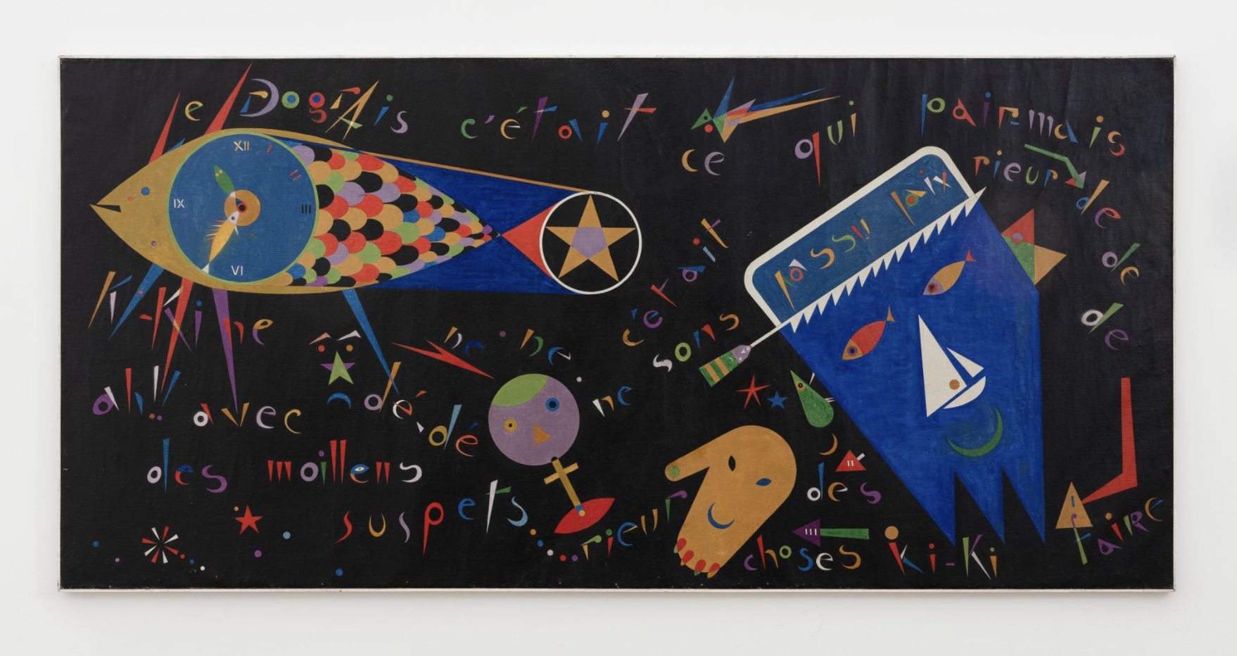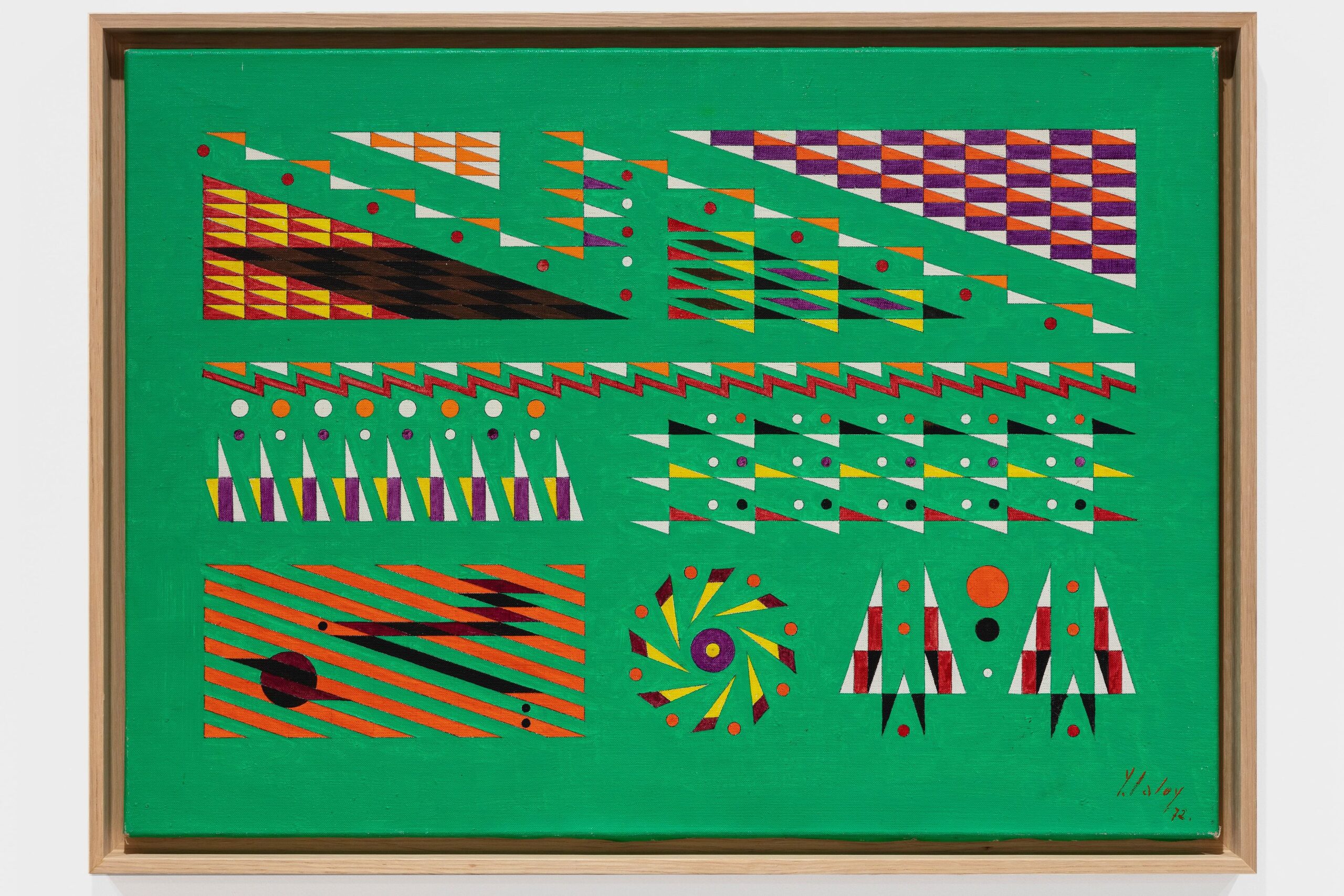 Laloy’s training as an architect had a great influence on his technique. Even before using paints and brushes, the artist traced the slightest shape and outline of his compositions with a pencil directly on the canvas laid flat, using a T-square and with the help of rulers, compasses and triangles. Then, mechanically, he applied a light and precise pictorial layer, often without modeling and shadows. The color palette is highly vivid, a play on contrasts and often an expression of violence or passion. The works on view here underscore his meticulous and structural appreciation of how space could be constructed. Works exude a range of structural and formal vocabularies, moving from gyrating, cartoonish bodies to carefully assembled grids of gestures and patterns.