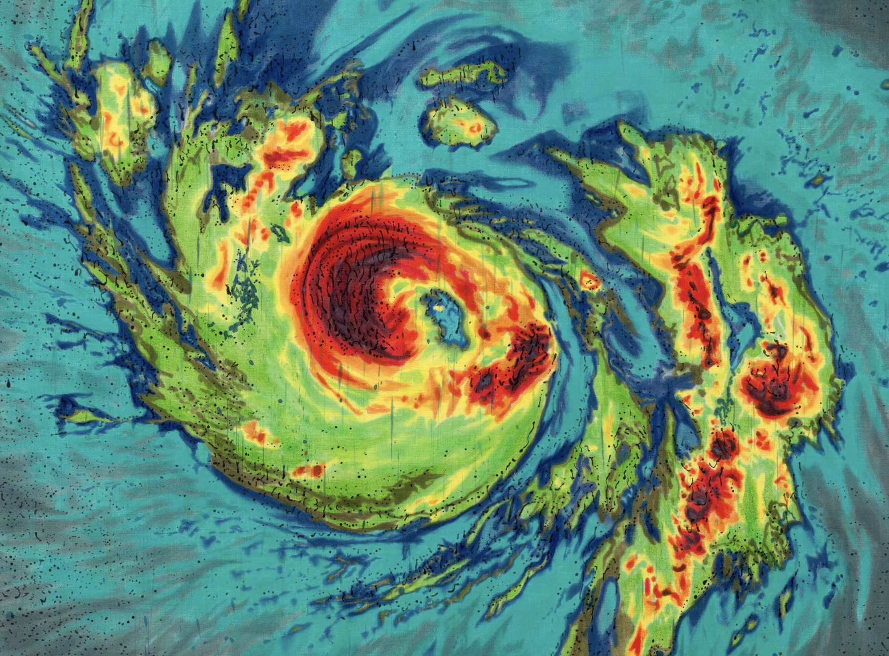 Since the early 2000s, the artist has continually pushed the boundaries of his multimedia approach with works that are at turns critical, humorous, political, and poetic. In his work, Lowman stages an encounter with commonplace, universally recognizable motifs, questioning and revisiting their intended meanings while creating new narratives in the process. This show continues that mode, featuring a series of new large-scale, vibrantly saturated paintings that depicts “false color” satellite renderings of hurricanes which have struck the United States in recent decades with increasing frequency and devastation, continuing the artist’s ongoing interest in this imagery. Lowman examines the painterly possibilities afforded by their rendered, non-referential colors, devised to highlight variations in cloud temperature. Overlaid with black dotted and gestural markings akin to those from a blurred Xerox, the resultant canvases play on the tensions between the technological and the painted image, and representational imagery and pure color.