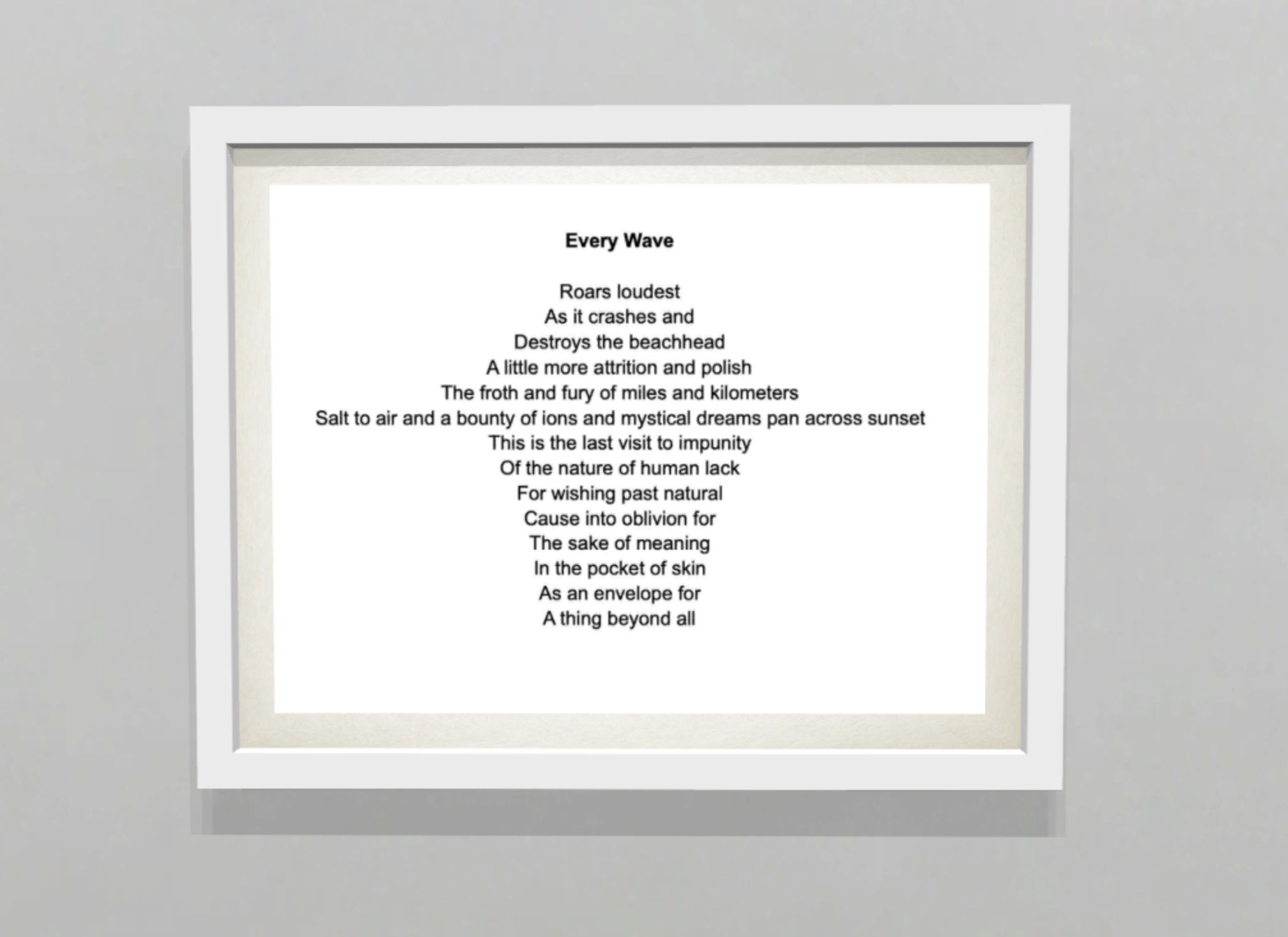 Other work draws on the interaction of language and image as the contingent parts of new models of communication, one that exists post-meme and post-Twitter, drawing on both parts in the realization of a new hybrid form of expression. In artist Kevin Dudley’s Think Positive Thoughts, for instance, the iconic smiley face graphic, a base image of the modern lexicon of digital expression, serves as a frame for a shifting series of graphics that appear as a collaged series of machine learning patterns, replicating and blending together the work of painter Thomas Kinkade. Turning the artist’s pastoral kitsch into a time-based vector, bound up in a smiling face, the work makes an intriguing comment on the particular idealism of his work, the artist’s disturbing death, and the shared notions between the two graphical elements as flat, single-note expressions of feeling that may, quite literally, “paint” over a nuanced and complex emotional range. All this from a single shifting gif and a smiling visage. A more direct version comes from Patrick Meagher’s untitled work, a poetic text that rises and falls in length as it describes a roaring wave as metaphor for a rush of energy exceeding the limits of the body. Elegant in its simplicity, the work takes on an intriguing contextual bent here, a sort of abstraction of an artist statement that draws the viewer an image of the show moving beyond the physical form, a space beyond time.