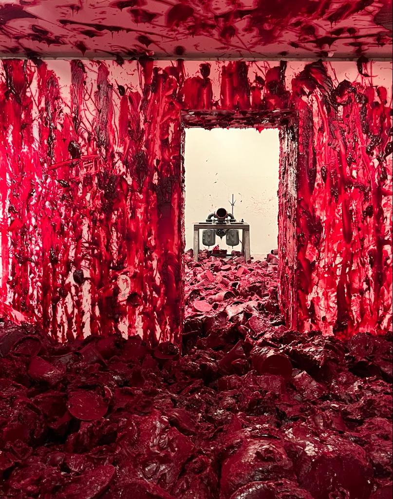 Spanning the museum’s halls, the show also includes a number of his works with wax and automated technologies, as well as thick heaps of dense red pigments and oils, marking something of a conceptual parallel to the gleaming, clean surfaces and vacuous holes in space. In one classic work, in which a cannon fires heaps of wax against the wall, gradually filling the space with a visceral mass of red streaks and blobs. In the same way that Kapoor’s other work seems to obliterate space by absence, the pieces here achieve a similar end result by creating an abundance of body, signifiers that so explicitly conjure the compositional structures of the human body that its presence becomes almost unbearably apparent.