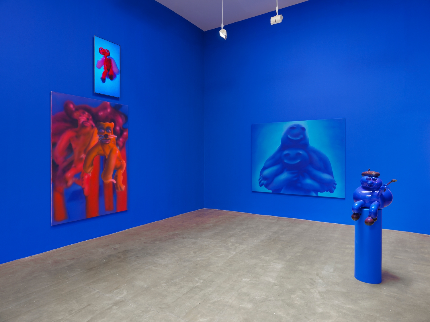 The lumpy, twisting forms in Lee’s work makes much of the body as something to be considered in spaces beyond the corporeal, masses of digital material that seem to push beyond the notion of the human. In one work, a group of figures beam for an imagined camera, surrounded by a halo of light and swathed in a deep blue glow that gives their smiling visages an eerie sensation. In one sculpture, a looping, slender seraphim descends from the heavens, suspended over the gallery with an equally pleasant smile on its face. Elsewhere, Lee’s smiling figures pose in moments of seeming boredom, avatars of space where nothing seems to really happen. In others, child-like creatures contend for the viewer’s attention. Throughout, there’s a sense of the world as something held just beyond the painting, these images standing in for their referent in subtle, surreal ways.