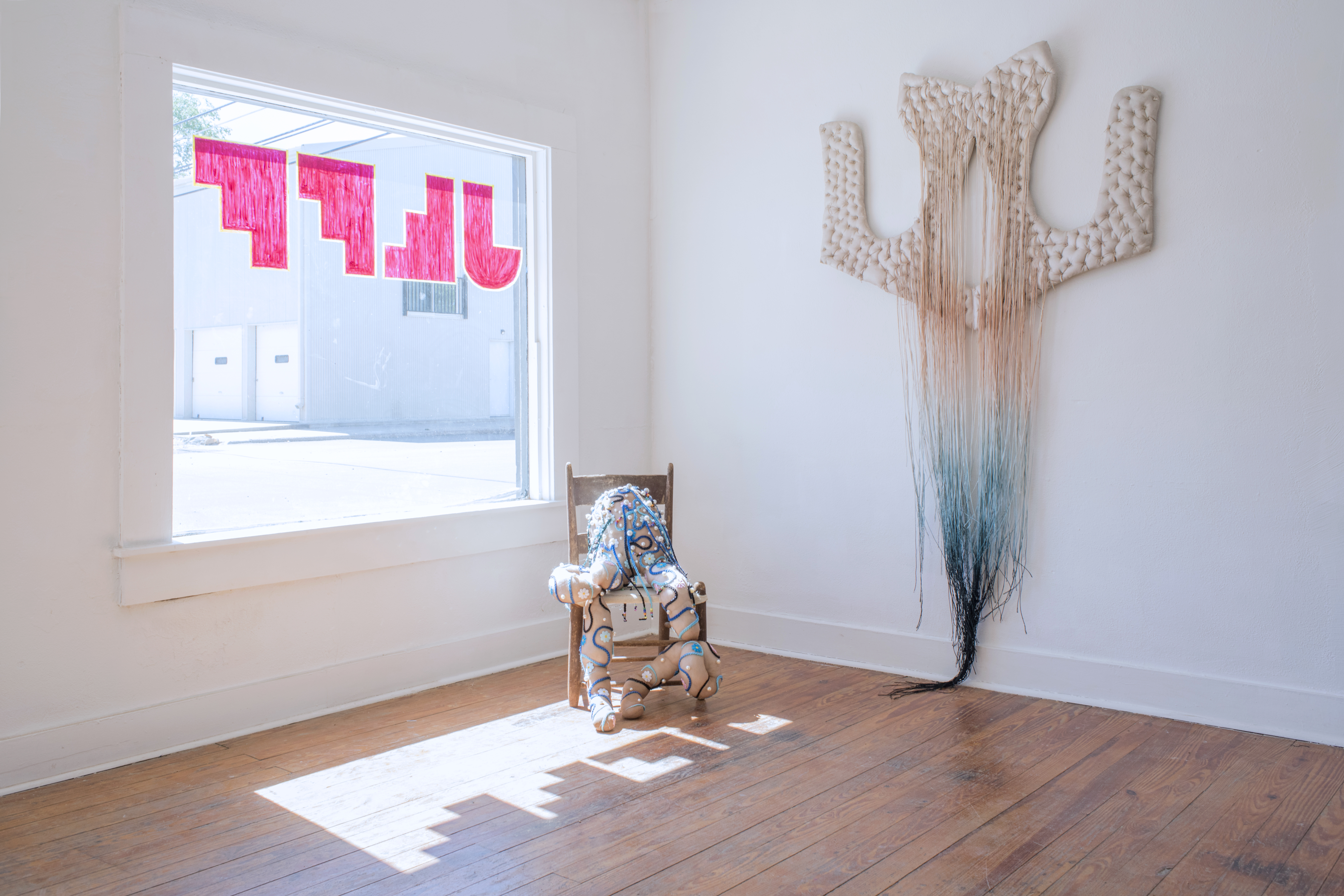 Amy’s colorful surrealist sculptures are made of resin and plaster and look like they will become animate at any given moment, running off on their spindly legs. Aurora’s textile works are rooted in the cosmological, grappling with conceptions of the earth, landscape, and fertility rites. Using traditional craft techniques such as felting and weaving that she learned from indigenous communities in her native Mexico, Aurora creates tapestries that evoke a distinct ancestral female lineage in which life, death, and rebirth are interwoven. Meanwhile, Victoria’s work is grounded in the particular experience of living in a disabled body as a young Black woman. Her soft hand-sewn sculptures, slouched in chairs throughout the gallery, depict cartoonish anthropomorphic limbs adorned with beadwork, pearls, and tassels.
