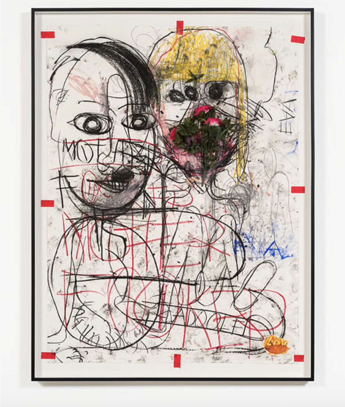 The works are, for lack of a better expression, trademark McCarthy, massive swoops of line of spatters of evocative abject colors, bringing the works down to a base expressionism that serves his subject matter well. Images are dotted with the faces of Hitler and Eva Braun, created while in character in collaboration with Stangenberg. McCarthy improvised performances between himself and Stangenberg while in character as forms of Adolf and Eva, and the images ultimately serve as documentation of both McCarthy’s incisive critical lens and his career-spanning omnivorous practice including performance, video, and drawing. The A&E drawings will be accompanied by a video work from the drawing sessions along with the platform sculpture the drawing performances were enacted upon, a strange stack of antique tables that equally calls to mind a gallows.