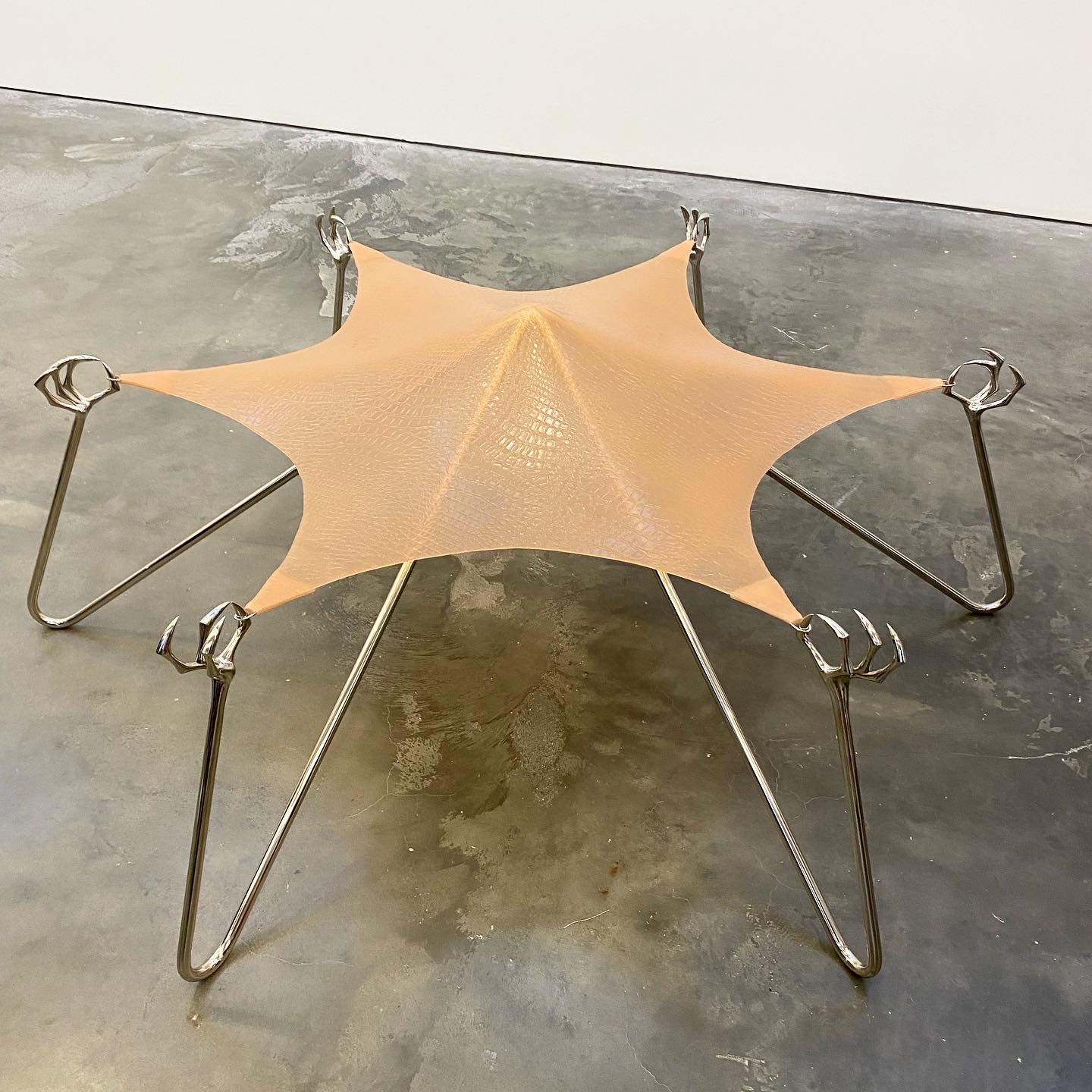 Other approaches towards the industrial come from artists like Kristin Walsh and Hannah Levy, each exhibiting taut aluminum and steel works, respectively, that underscore human interrelation with mechanical processes, and the capacity for new forms emerging from industrial processes. while artist Jessi Reaves renders a reverse process on humble materials often found or scavenged. Her sculpted forms, handmade and at times irrational, are never fully detached from function. In European Yellow Couch (2018), Reaves transforms the upholstered sofa, cutting, painting and rearranging to turn the figure inside out, revealing a new definitive structure. Reaves’ objects are a funhouse facsimile of their original design, questioning the purpose of construction and toying with perceptions of practicality and aesthetics.
