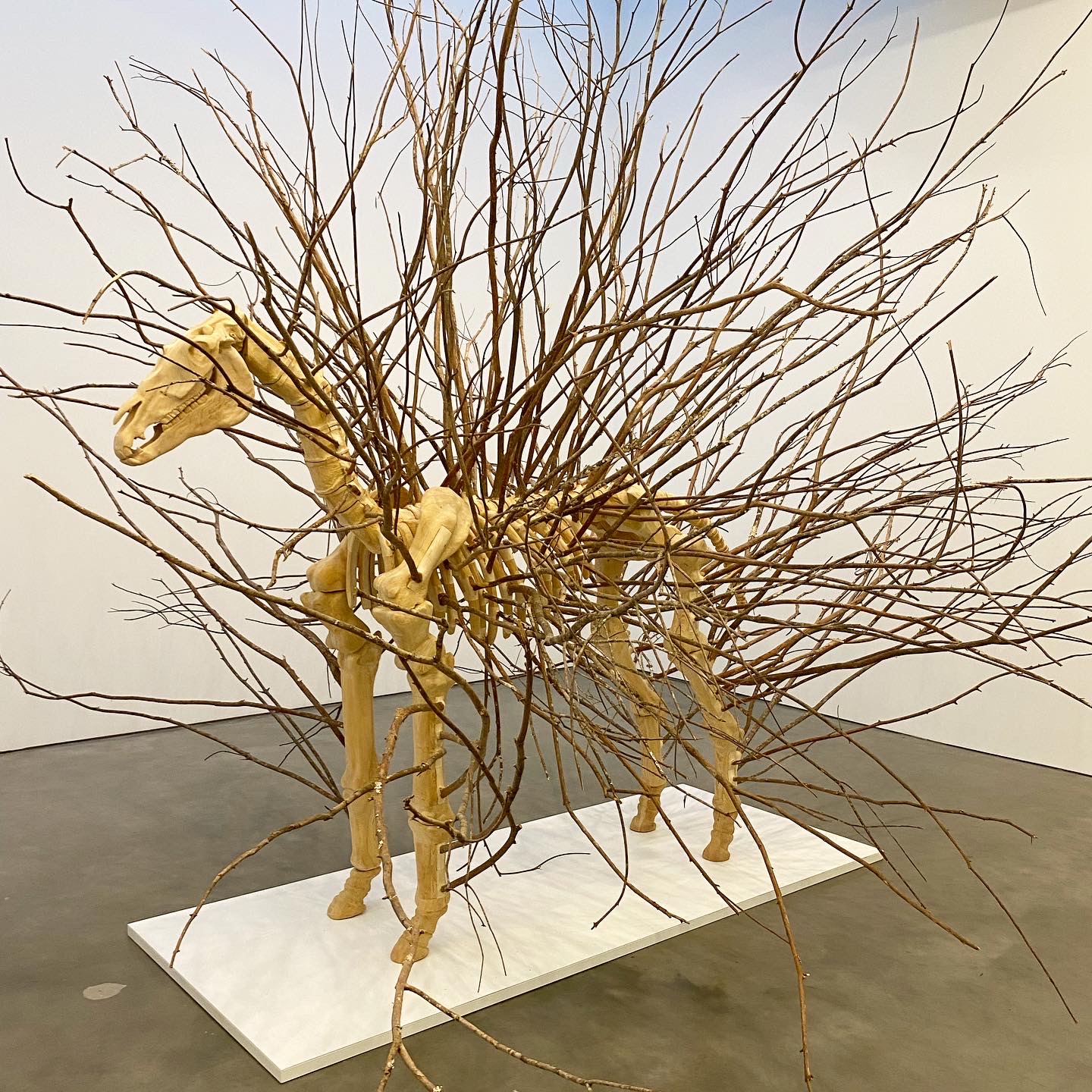 A colossal equine by Hugh Hayden stands at the entrance of the gallery, continuing the artist’s exploration of layered meaning and significant associations with societal categorization: race, religion, ethnicity, etc. This is paralleled by work by Kristi Cavatoro, a pair of large stained-glass sculptures, one mounted to the wall and the other situated on the floor. The multifaceted structures, at once rounded and cubic, are the product of tedious mathematic calculations and hands-on construction, adapted from the technique of Louis Comfort Tiffany.