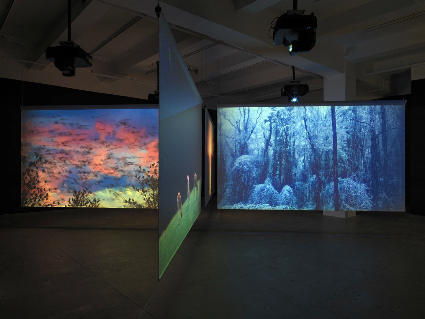 The artist’s approach towards history and memory, space and experience remained an ongoing part of his practice, from his early works on through his more recent pieces, including the video installation Subliminal (2020), one of the last artworks created by the artist. The installation spreads over four large projections on which hackneyed images of joyful moments and “cliché” imagery is used as a cover for a series of horrifying historical depictions that complicate readings of the wealth, prosperity and violence of the 20th Century. This is countered by works like Animitas (Mères Mortes) (2017) , another video work placed along with a bed of gravelly sand to momentarily bring the viewer to the shores of the Dead Sea , and to express a physical continuation of the quiet desert landscape, inviting visitors to enter a meditative state.