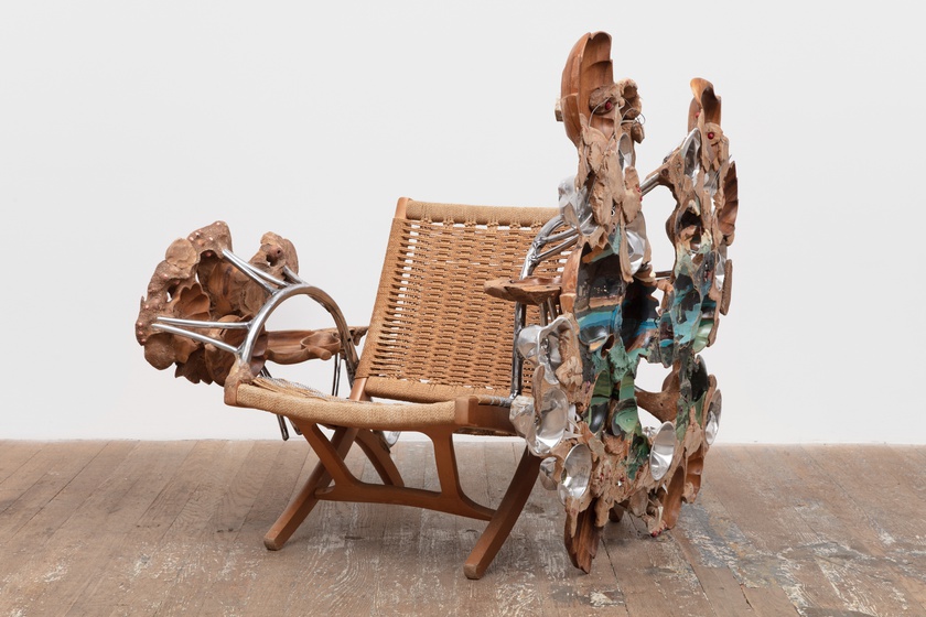 Reaves’ works are wildly constructed, drawing on plywood, sawdust, foam, wood, car parts and plexiglass, often complemented with finishing touches like silk, leather, zippered covers and glass. They are, to some degree, an unassuming set of elements, applying found materials and pieces in conjunction with her own sculptural embellishments. Irrational and imperfect, their human scale and materials reference historical and archetypal forms, their compiled pieces and parts unifying in a grand operation that mixes together varied concepts and histories of both labor and design.