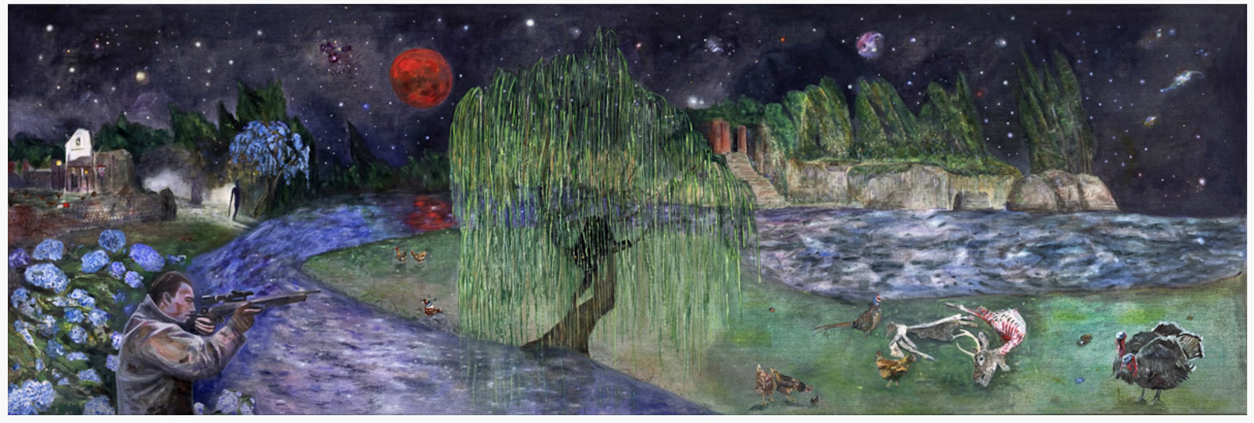 Mulleady’s work functions at a strange intersection of the ephemeral and the subtly sinister, arranging bodies and scenes in a way where a single daub of paint, or what seems to be a casual detail, opens the pieces up the new interpretations and buried narratives. In one work, The Vampire, Mulleady depicts her main subject wrapped around a tree, her lip touched with a slight fleck of blood red. Nearby, a body lies in the snow, while a picturesque winter scene seems to unfold around the character. The work is undeniably macabre, and seems to become even more so when considering the strangely peaceful backdrop. Another work, Mars, performs a similar operation, with a flowing night sky reminiscent of Van Gogh’s luminescent scenes; yet here, Mulleady accompanies the image with a gory, gruesome series of animal carcasses, and a hunter to the bottom of the image, aiming carefully.