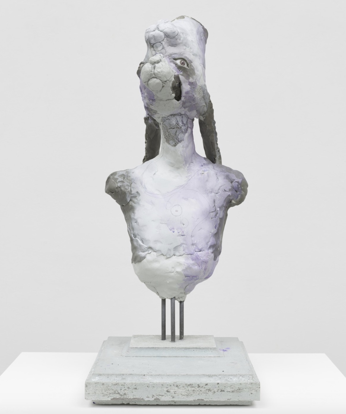 Rowed plinths line the lower gallery, mimicking a classical sculpture court and displaying a fantastical array of bust and heads. Sometimes fragmentary and possibly time-worn, they suggest archaeological finds, parts of animal-headed deities, but might also be extra-terrestrial specimens or the result of genetic experiments. A series of subtle interventions throughout the space suggests networks of unseen activity: smeared toothpaste, pencil notations and entry points to a presumed warren. His busts and figures twist the human into the hare, each with a disturbing mode of execution that mines the familiar with the foreign.